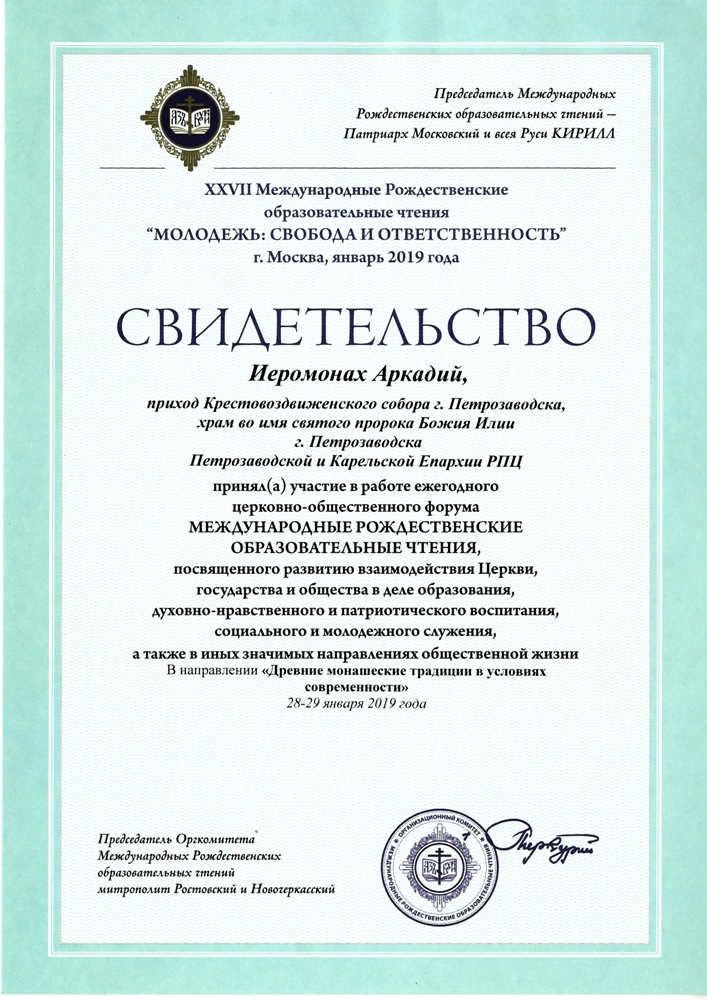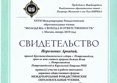28 – 29 января 2019 года в Зачатьевском ставропигиальном женском монастыре г. Москвы состоялась работа XIV направления «Древние монашеские традиции в условиях современности» ХХVII Международных Рождественских образовательных чтений, посвященных теме «Молодежь: свобода и ответственность». По благословению митрополита Константина от Петрозаводской епархии в работе монашеского форума принял участие иеромонах Аркадий (Лозовский), штатный клирик Прихода Крестовоздвиженского собора г. Петрозаводска, кандидат богословия.