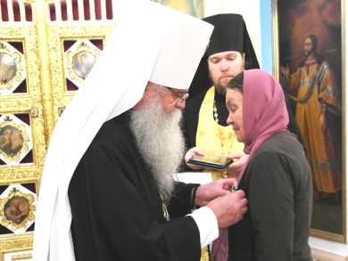 Также Владыка поздравил регента нижнего клироса собора Кабанову Таисию Ивановну с 80-летием, поблагодарил за многолетний труд на благо храма и вручил ей по этому случаю медаль преподобного Лазаря Муромского II-й степени и денежную премию.
