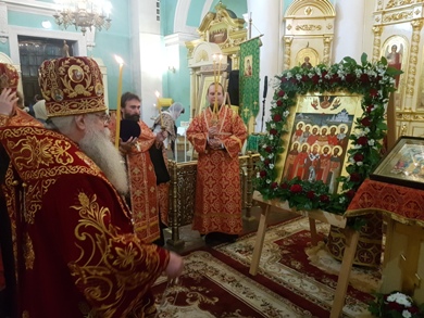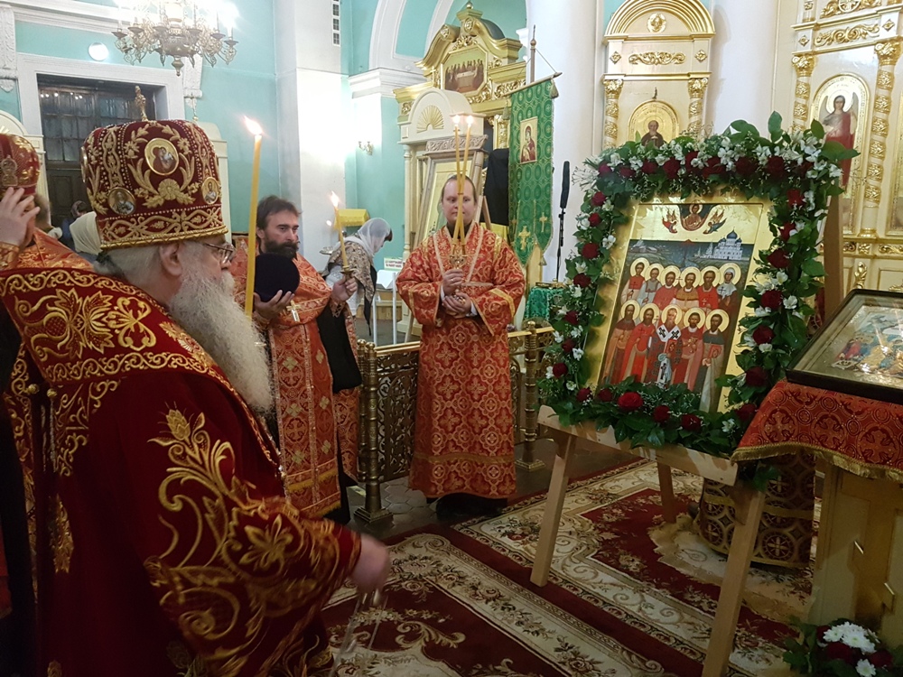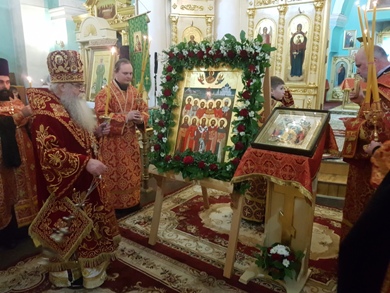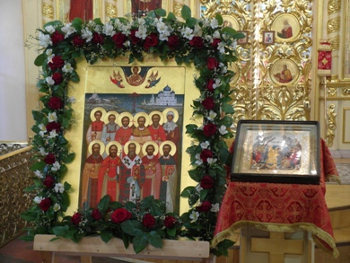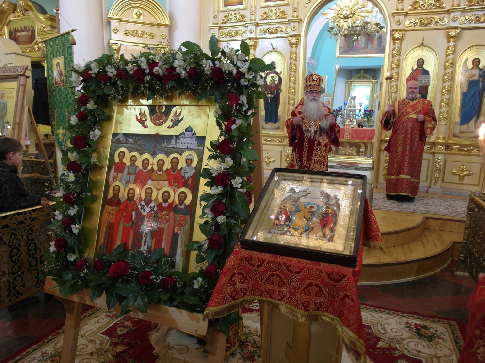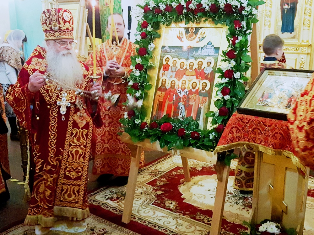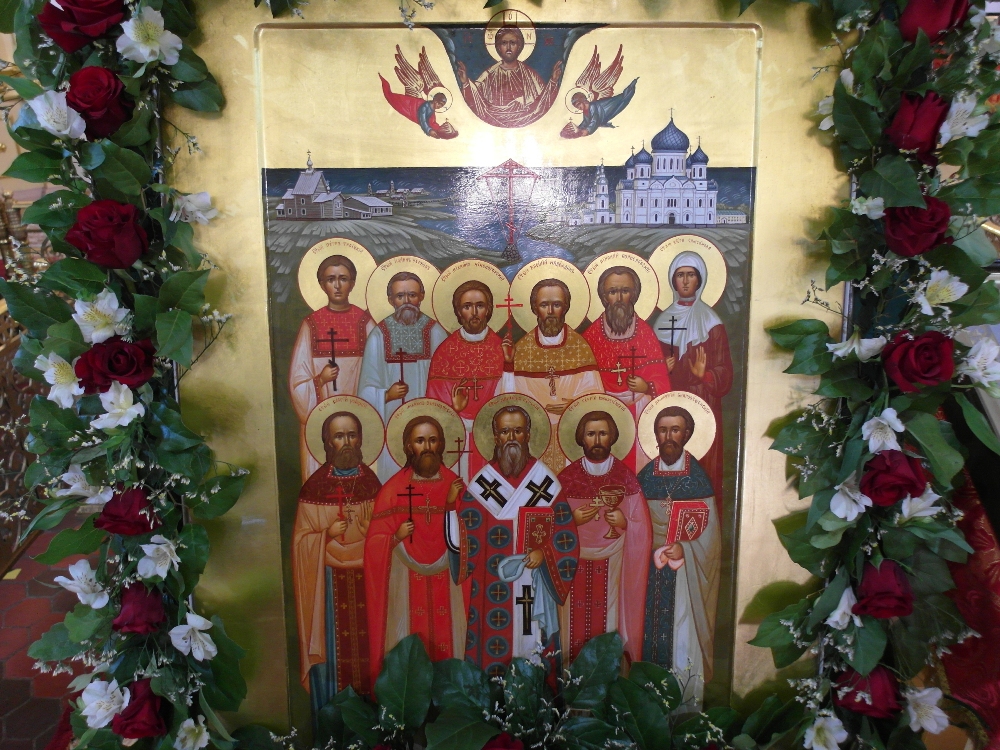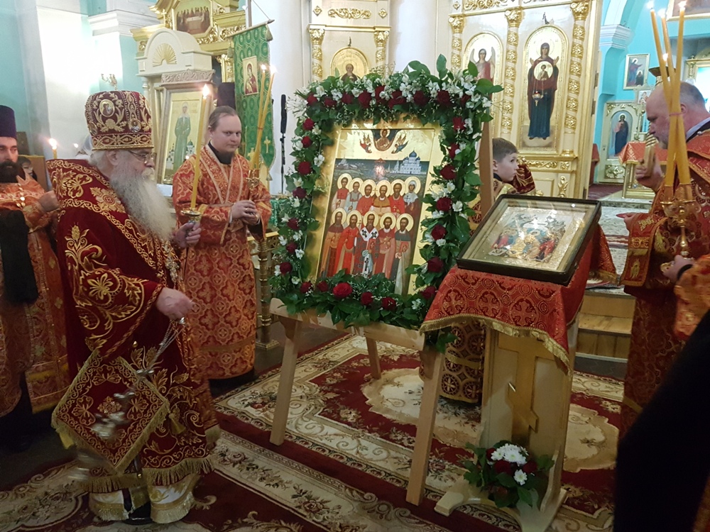 Во время полиелея владыка Константин совершил освящение новонаписанного образа Собора новомучеников и исповедников Карельских. Образ был создан к сегодняшнему празднику по благословению митрополита Константина в иконописной мастерской города Кондопога карельскими мастерами – иконописцами. Композиционно новая святыня напоминает известный и любимый всеми жителями нашего края образ всех святых в земле Карельской просиявших. На иконе изображены святые лики 11 новомучеников и исповедников - сщмч. Дамиан (Воскресенский), архиепископ Курский; сщмч. Николай Богословский, протоиерей; сщмч. Сергий Увицкий, протоиерей; сщмч. Михаил Зеленцовский, иерей ;сщмч. Сергий Воскресенский , иерей; сщмч. Михаил Никологорский , иерей; сщмч. Димитрий Благовещенский, иерей; сщмч. Василий Надеждин, иерей; мч. Петр Троицкий, мч. Иоанн Чернов ;мч. Вера Самсонова - совершивших свой подвиг на карельской земле. Обрамляют образ символические изображения ныне утраченных святынь карельской земли, прикровенно отображающих в себе агиотопографию подвига новомучеников. Справой стороны - старый кафедральный Свято –Духовский собор, уничтоженный большевиками в 1936 году, Воскресенская и Петропавловская церкви, сгоревшие в 1924 году, символизирующие собой Олонию и Заонежье, а слева – небольшой деревянный храм находившийся в виенской Кеми.