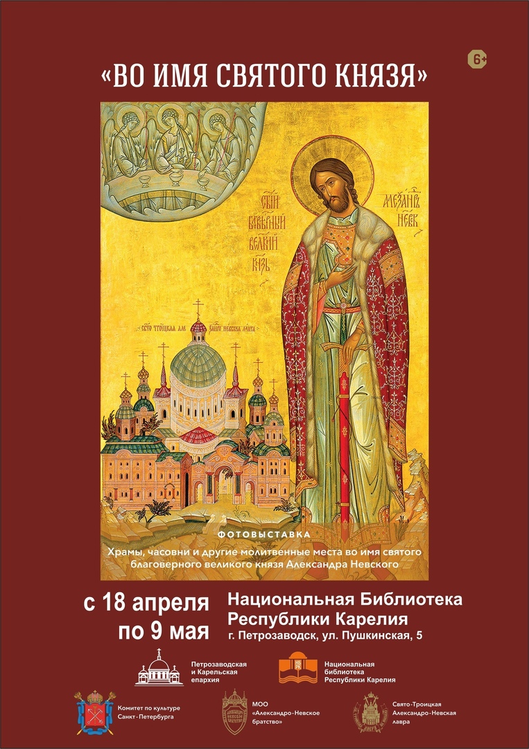 18 апреля, в 15-00, в Национальной библиотеке Республики Карелия состоится открытие фотовыставки "Во имя святого князя". В экспозиции будут представлены 100 фотографий из одноименного альбома-энциклопедии, составленного наместником Александро-Невской лавры епископом Кронштадтским Назарием. Трехтомное иллюстрированное издание посвящено храмам, часовням, приделам и другим молитвенным местам во имя святого благоверного князя Александра Невского. Посетители фотовыставки «Во имя святого князя» узнают о храмах в честь святого князя Александра Невского в России и за рубежом, как действующих, так и разрушенных и занятых другими учреждениями. Приглашаются все желающие! Информационный отдел Петрозаводской и Карельской епархии по материалам интернет-страницы прихода Александра-Невского кафедрального собора, 2021 год.