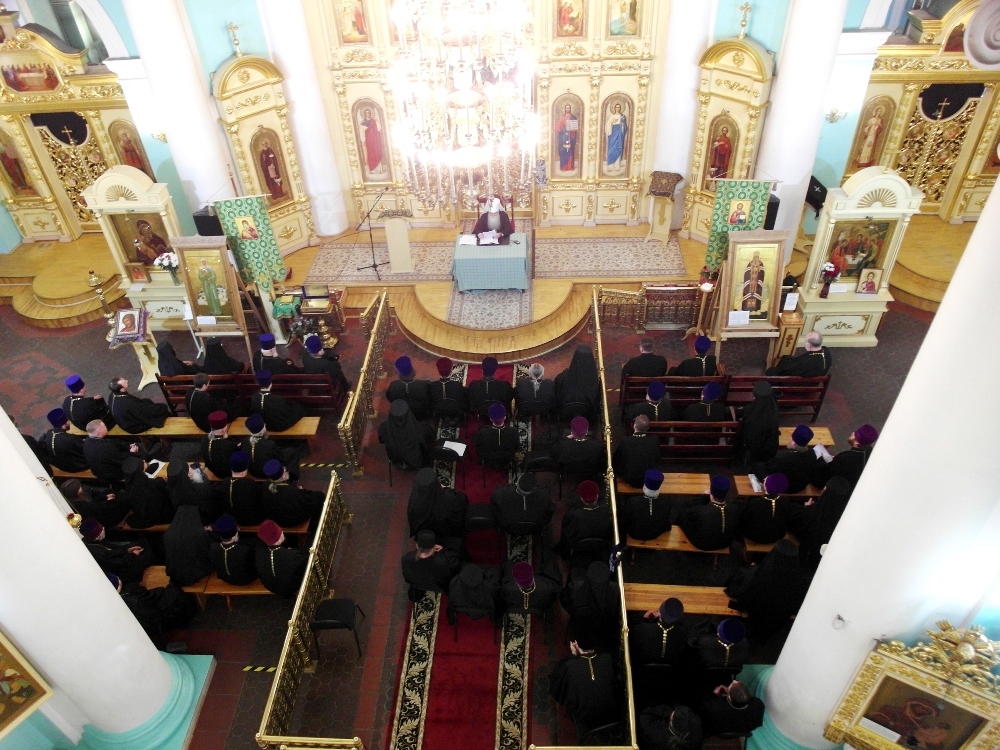 В клире епархии состоят: Епархиальный архиерей, 82 священника и 12 диаконов. Всего 95 священнослужителей. В 2020 году принят в клир епархии клирик из Московской областной епархии – иерей Алексей Владимирович Кнутов. Временно командирован в другую епархию - иеромонах Сергий (Виноградский). Почислен за штат епархии – иеромонах Лазарь (Шарапов) из Муромского монастыря. В истекшем году ни один клирик, также как и в прошлом 2019 году, не был подвержен дисциплинарным взысканиям. В прошедшем году отошли ко Господу 3 клирика епархии: насельник Важеозерского монастыря игумен Афанасий (Пименов), настоятель Успенского храма г. Олонца протоиерей Виктор Колесников и протоиерей Николай Николаев из г. Пудожа. Почившие внесли заметный вклад в церковную жизнь Карелии и оставили о себе добрую память. Мы скорбим об этих утратах и верим, что Всещедрый Господь упокоит их в селениях праведных, где нет болезни, печали и воздыхания. Пропоем им «Вечную память»! В прошлом году я осуществил четыре рукоположения насельников монастырей: в иеромонаха – Григория (Дворянкина); во иеродиакона – Тихона (Мельничука); во иеродиакона – Симеона (Банева); во иеродиакона – Серафима (Кошкина). В Петрозаводской епархии действует 5 отделов и 1 комиссия, которые координируют деятельность в различных областях церковного служения. Как и в предшествующие годы, в управлении епархией мне помогал Епархиальный совет. В отчетном году прошли 4 заседания Епархиального совета Петрозаводской и Карельской епархии. Состоялось 2 заседания архиерейского совета Карельской митрополии.