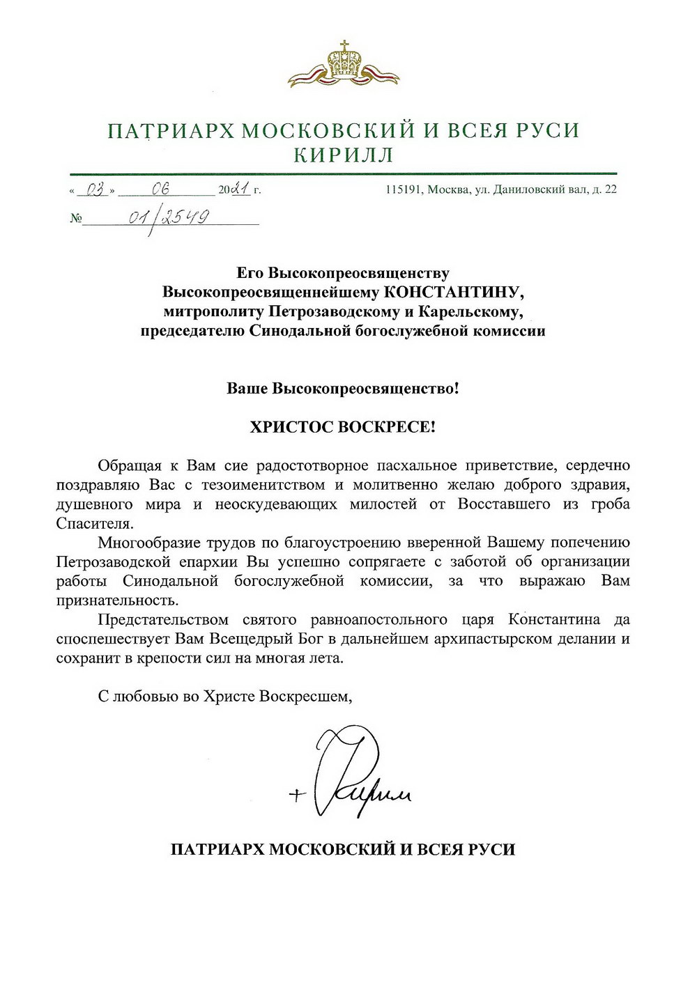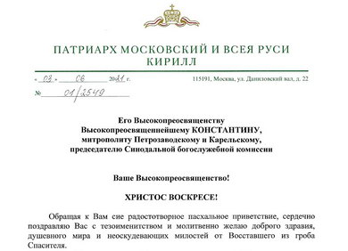 Многообразие трудов по благоустроению вверенной Вашему попечению Петрозаводской епархии Вы успешно сопрягаете с заботой об организации работы Синодальной богослужебной комиссии, за что выражаю Вам признательность.