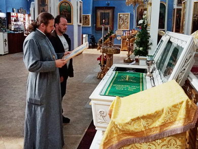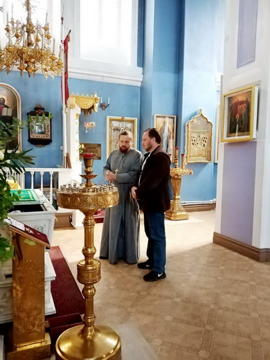А 24 июля почетного гостя возле Крестовоздвиженского собора встретил секретарь Петрозаводского епархиального управления священник Константин Павлюченко. Отец Константин провел для Александра Михайловича экскурсию по собору и Зарецкому кладбищу.