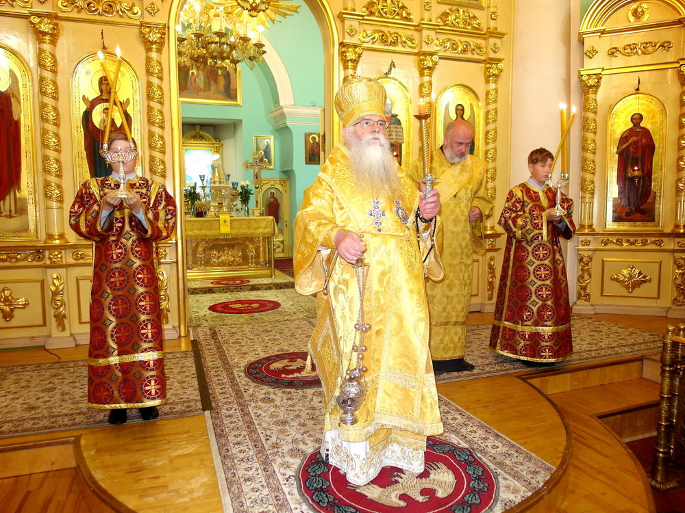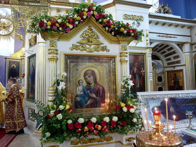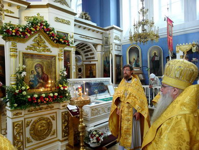 После литургии было совершено славление чудотворной иконе Божией Матери, именуемой «Троеручица», почитаемый список которой находиться в Крестовоздвиженском соборе Карельской столицы.
