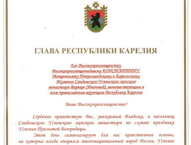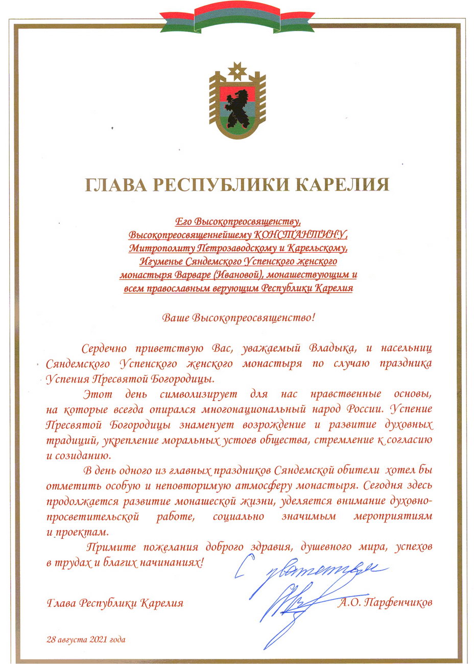 28.08.21 Поздравление Главы Республики Карелия по случаю праздника Успения Пресвятой Богородицы