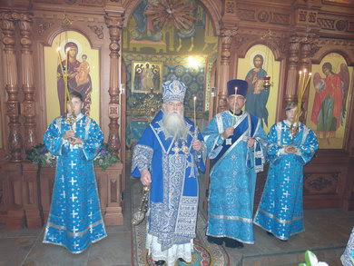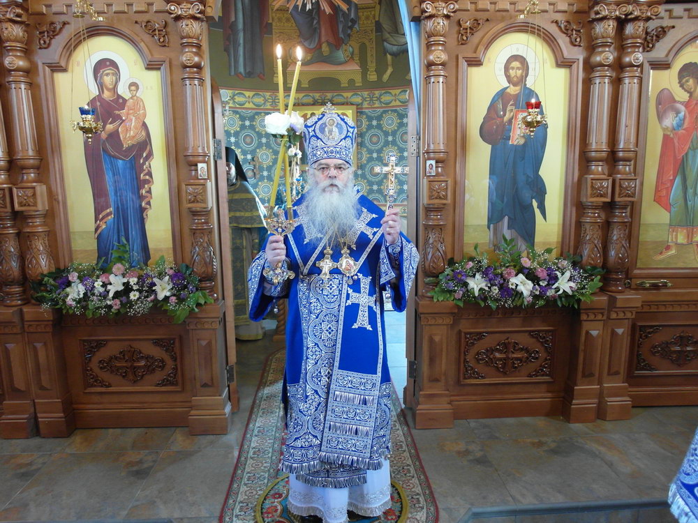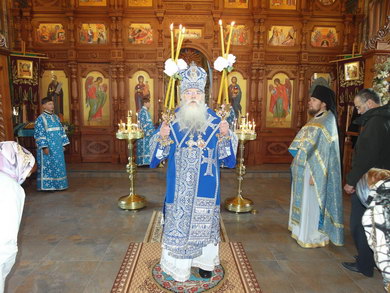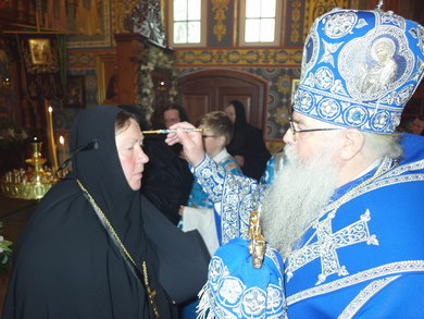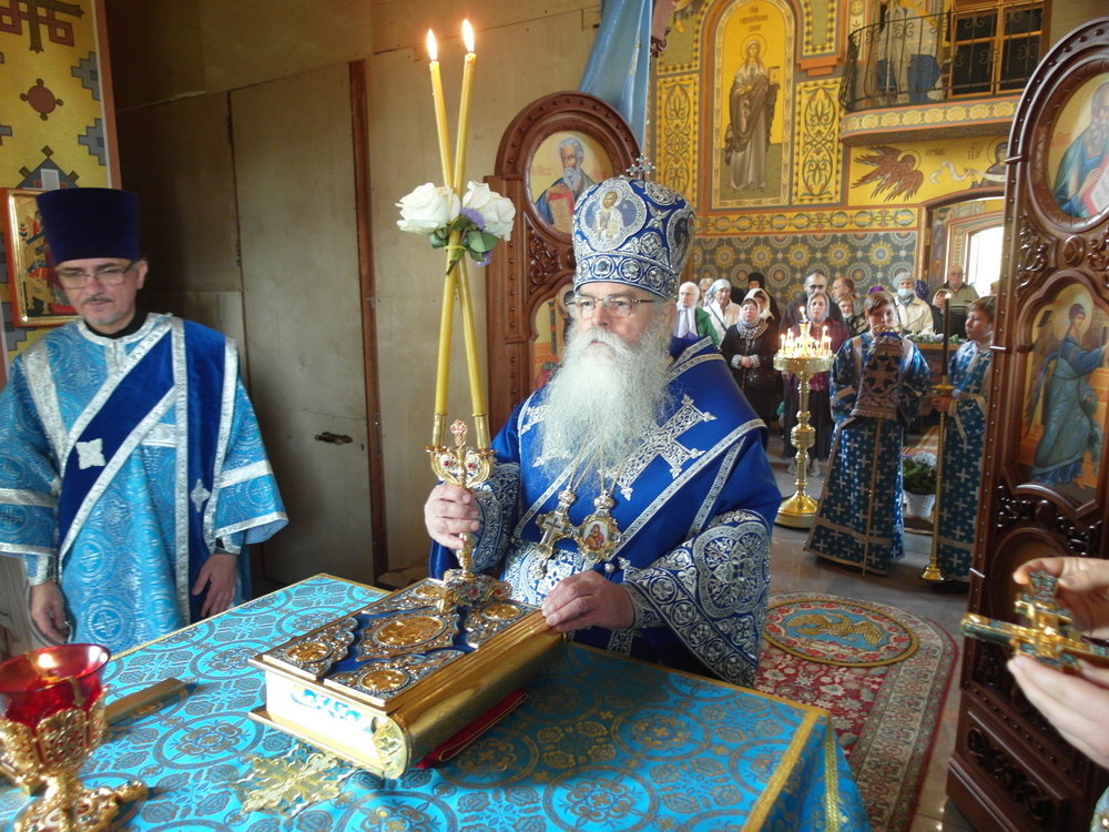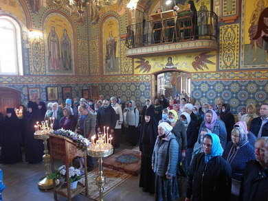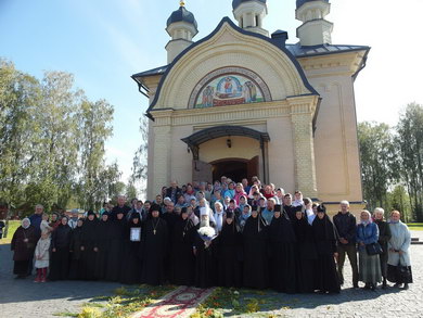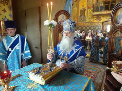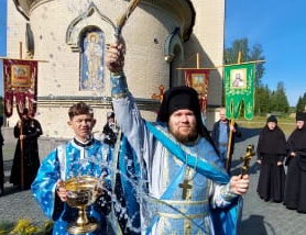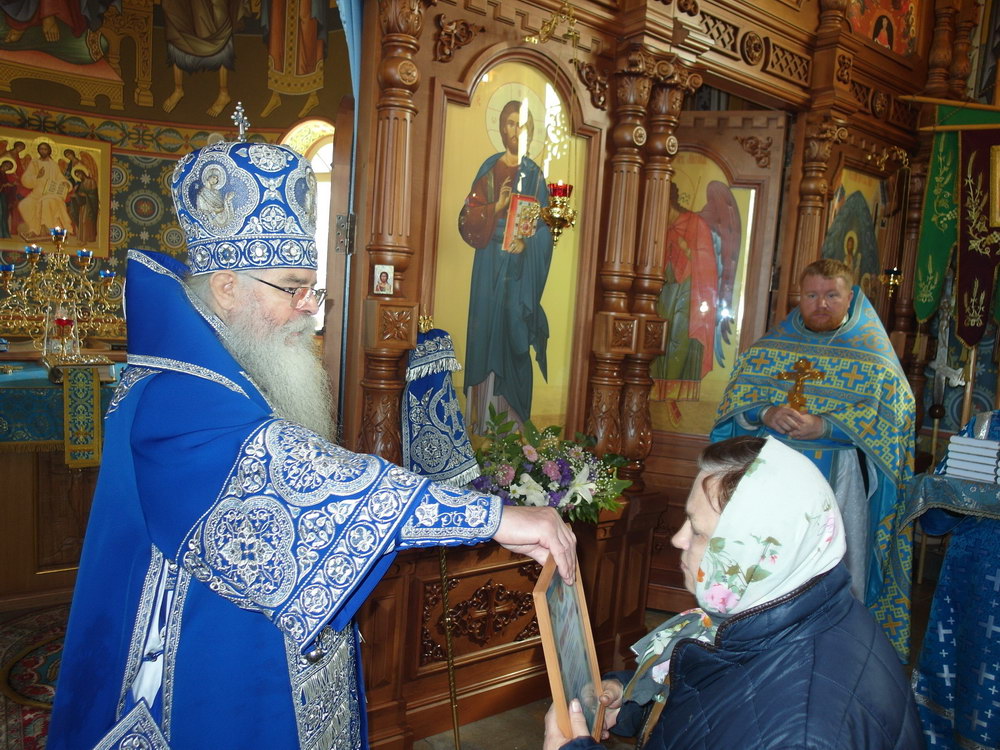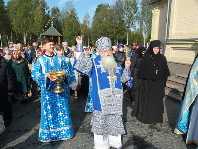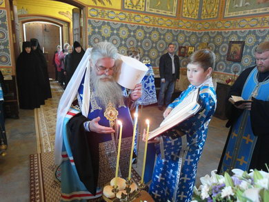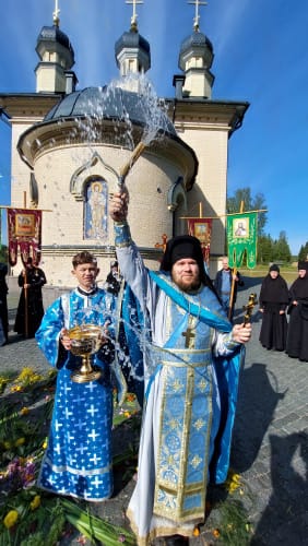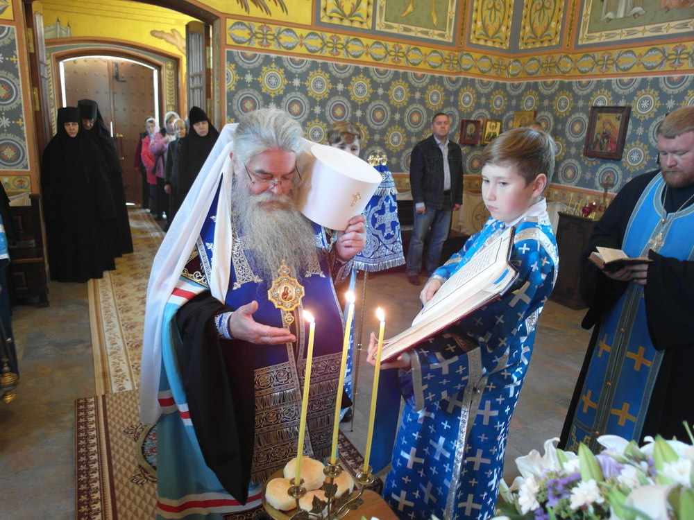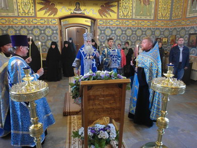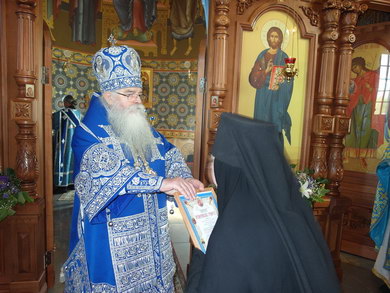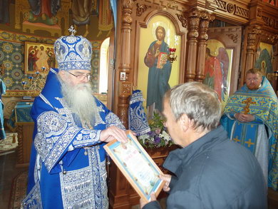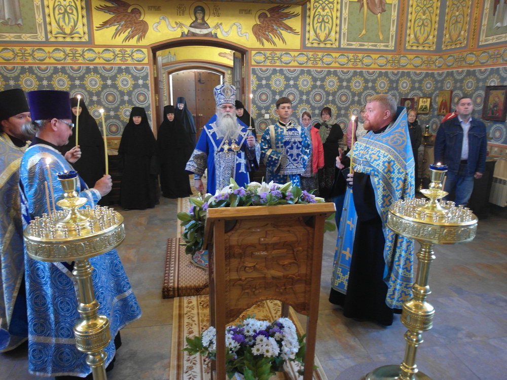 После Божественной литургии состоялся праздничный крестный ход. Затем Владыка поздравил всех с Престольным праздником и 10 – летием возрождения обители и зачитал Приветственный адрес. В дар монастырю владыка Константин передал Епархиальные издания, а также 12 – томное собрание сочинений святителя Иустина (Полянского) для строящегося духовно – просветительского центра.