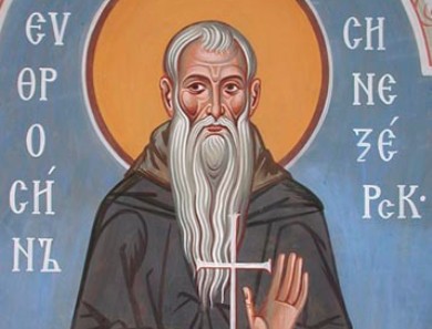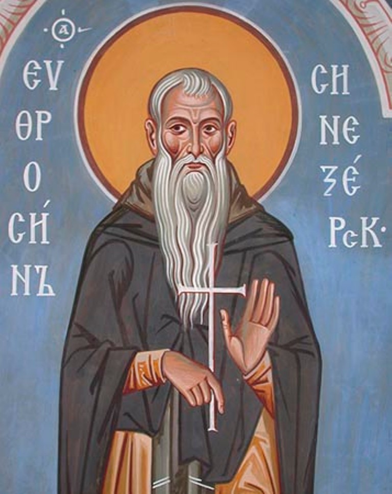 Преподобный Евфросин Синозерский, в миру Ефрем, родился в Карелии близ Ладожского озера. В юные годы он жил при Валаамском монастыре, затем переселился в Новгород Великий. Прожив там длительное время, святой ушел в одну из Новгородских областей - в Бежецкую пятину. Он стал причетником в селе Долосском в 20 верстах от города Устюжны Железопольской. Пострижение преподобный принял в Успенском Тихвинском монастыре. В 1600 году он начал пустынножительство в диких болотах на берегу Синичьего озера. Поставив крест и выкопав пещеру, преподобный прожил здесь два года, питаясь только дикими растениями. Нечаянно его нашли окрестные жители, которые стали приходить к преподобному за наставлениями, а некоторые оставались при нем жить. В 1612 году, когда польские отряды грабили Россию, в его пустыни спасалось от разбоя множество людей. Однажды преподобный Евфросин предсказал, что поляки идут в пустынь, и советовал всем бежать. Многие не поверили ему. "Почему же ты не уходишь от этого святого места?" - спрашивали они. Старец отвечал: "Я пришел сюда умереть ради Христа". Кто послушался святого и ушел из обители, спаслись, а те, кто остались, все погибли жестокой смертью. Среди насельников обители был и инок Иона. Устрашенный прозрением преподобного Евфросина, он хотел бежать вместе с прочими. Но преподобный Евфросин удержал его, воспламенив в иноке ревность к дому Божию и готовность пребывать в обители до смерти. "Брат Иона, - говорил преподобный, - зачем допускать в душу страх малодушия? Когда настает брань, тогда-то и нужно показать мужество. Мы дали обет жить и умереть в пустыни. Надо быть верным слову, данному пред Господом. В таком случае смерть вводит в покой. Другое дело - мирские люди: они не связаны словом, и им нужно беречь себя для детей". После этого святой облекся в схиму и всю ночь провел в молитве. На следующий день, 20 марта, на обитель напали поляки. Преподобный в схимническом одеянии вышел из келлии и стал у водруженного им креста. Враги бросились к нему: "Старец, отдай нам имение монастыря". "Все имение этого монастыря и мое - в церкви Пречистой Богородицы", - ответил преподобный, разумея то некрадомое богатство, которое для верующих сокрыто в Боге. Не понявшие его захватчики бросились к храму, а один из них вынул меч и ударил преподобного Евфросина в шею. Шея была перерублена до половины, и святой старец пал на землю мертвым. Когда поляки, озлобленные тем, что ничего не нашли в церкви, вернулись, убийца преподобного, не довольствуясь тем, что святой был уже бездыханен, пробил ему голову боевым топором. Погиб и инок Иона. Вместе с преподобным в обители остался также один благочестивый крестьянин, Иоанн Сума. Когда ворвались враги, он находился в келлии преподобного. Несмотря на тяжелые раны, полученные от иноземных захватчиков, Иоанн остался жив. По уходе поляков он пришел в себя и рассказал вернувшемуся сыну о том, что произошло. От них и узнали окрестные жители о разгроме обители и страдальческой кончине преподобного Евфросина. Тело преподобного было с честью погребено 28 марта. В тот же день погребли инока Иону и всех, кто погиб от меча. Спустя 34 года по кончине святого в его обители был возведен строителем Моисеем новый храм во Имя Пресвятой Троицы и колокольня с переходами. По благословению митрополита Новгородского Макария 25 марта 1655 года мощи пре