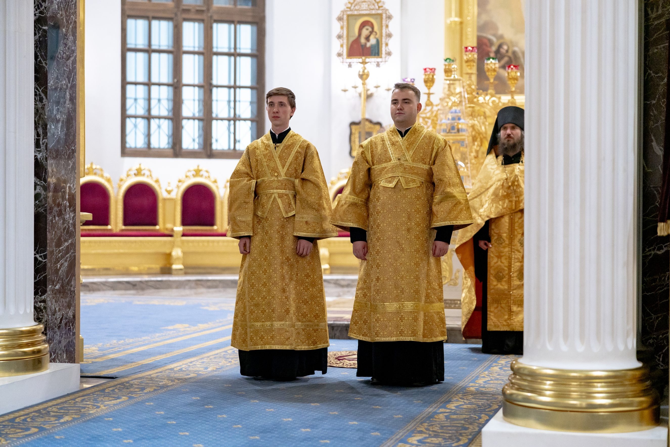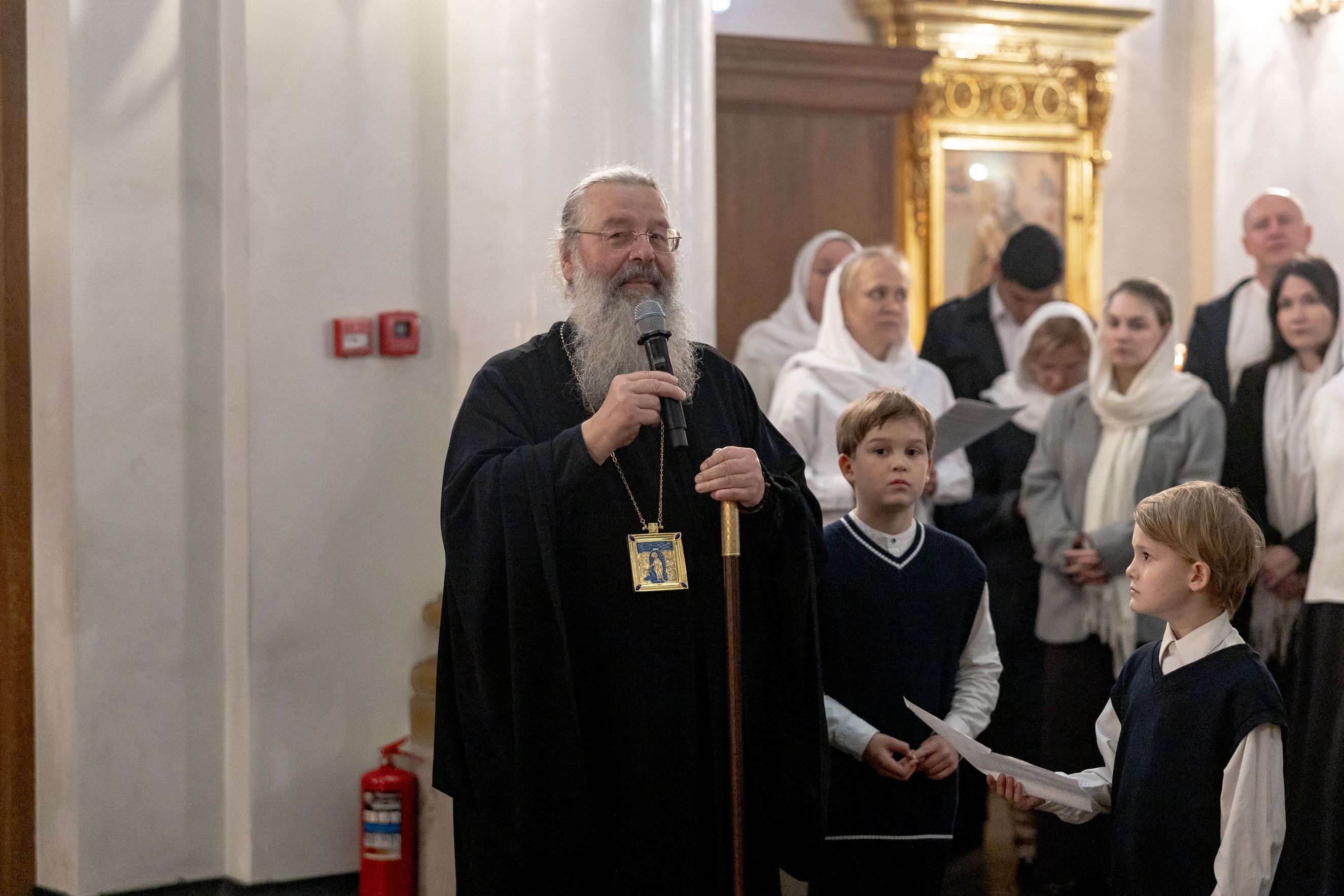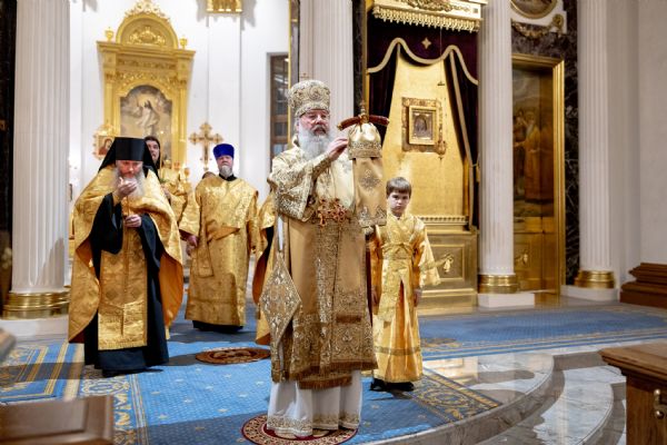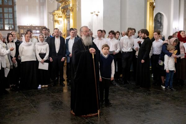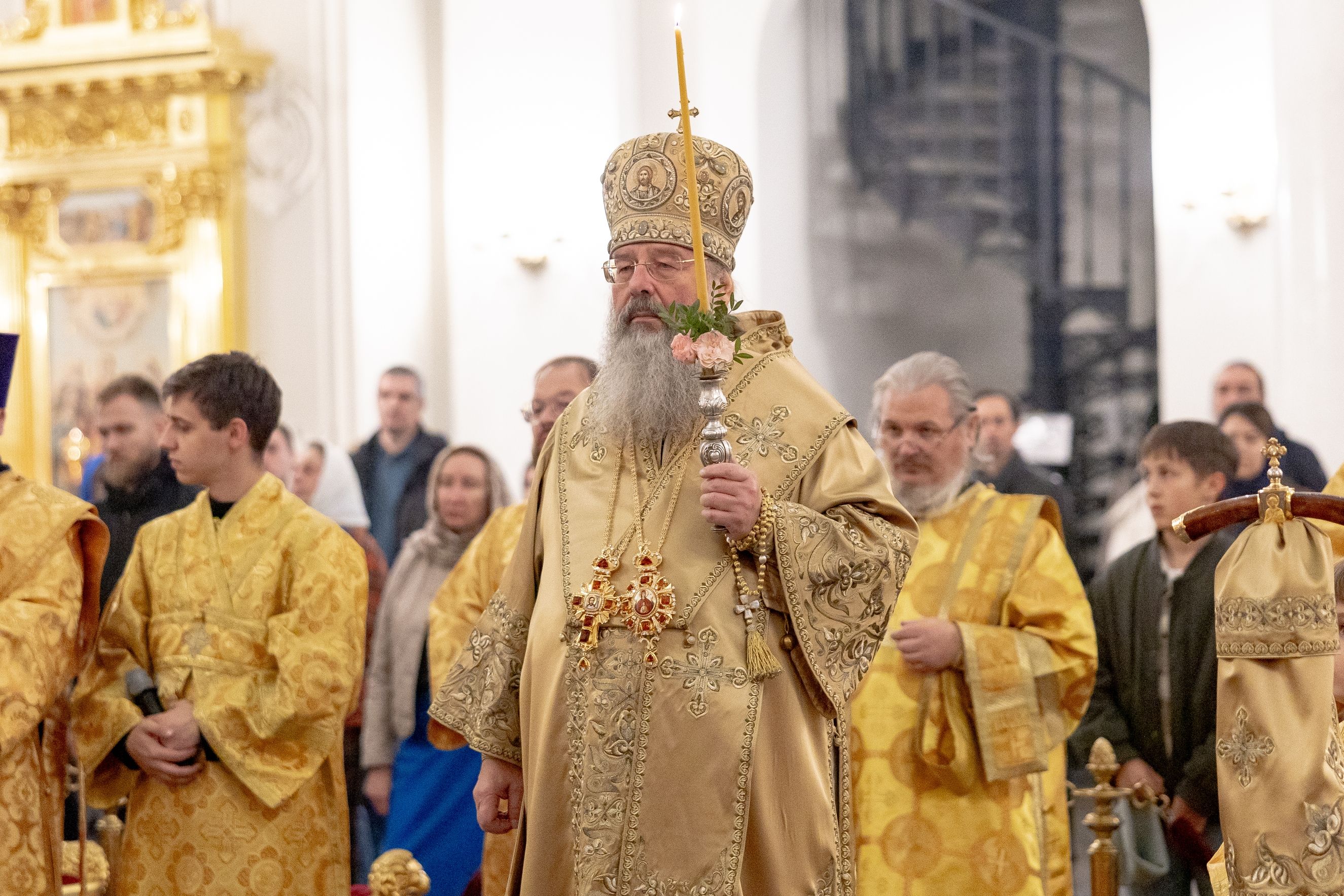 Его Высокопреосвященству сослужила братия Богородицкого монастыря в священном сане. Песнопения исполнили два архиерейских хора: смешанный под управлением Марины Литвиненко и мужской под управлением Дениса Рогова.