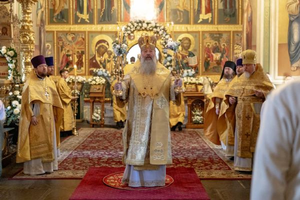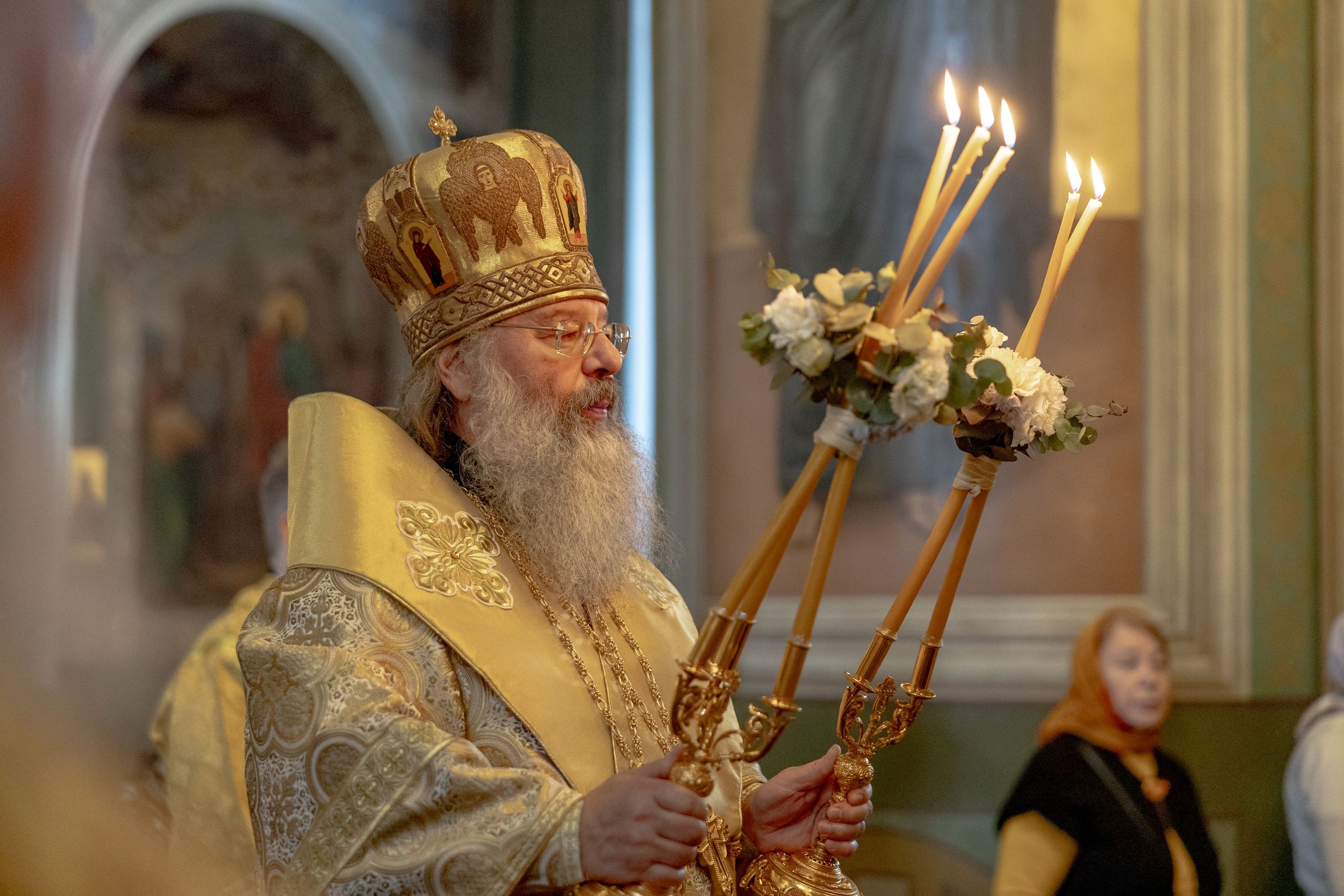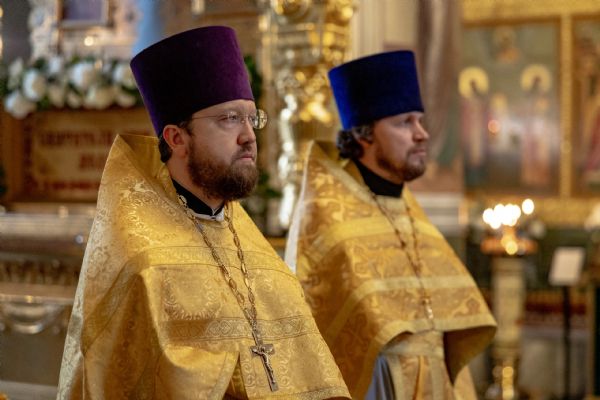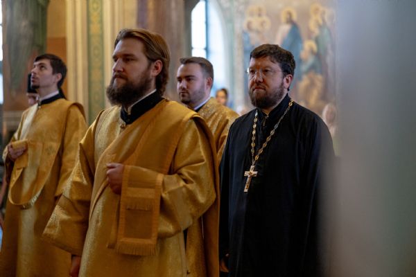 Его Высокопреосвященству сослужили благочинный I округа города Казани протоиерей Владимир Самойленко, ключарь Благовещенского собора иерей Виктор Бельских, клирик храма благоверного князя Александра Невского города Казани протоиерей Александр Хохлов, насельник Казанского Богородицкого монастыря иеромонах Иларион (Шпаков), клирик Иоанно-Предтеченского собора города Екатеринбурга иерей Петр Муратов.