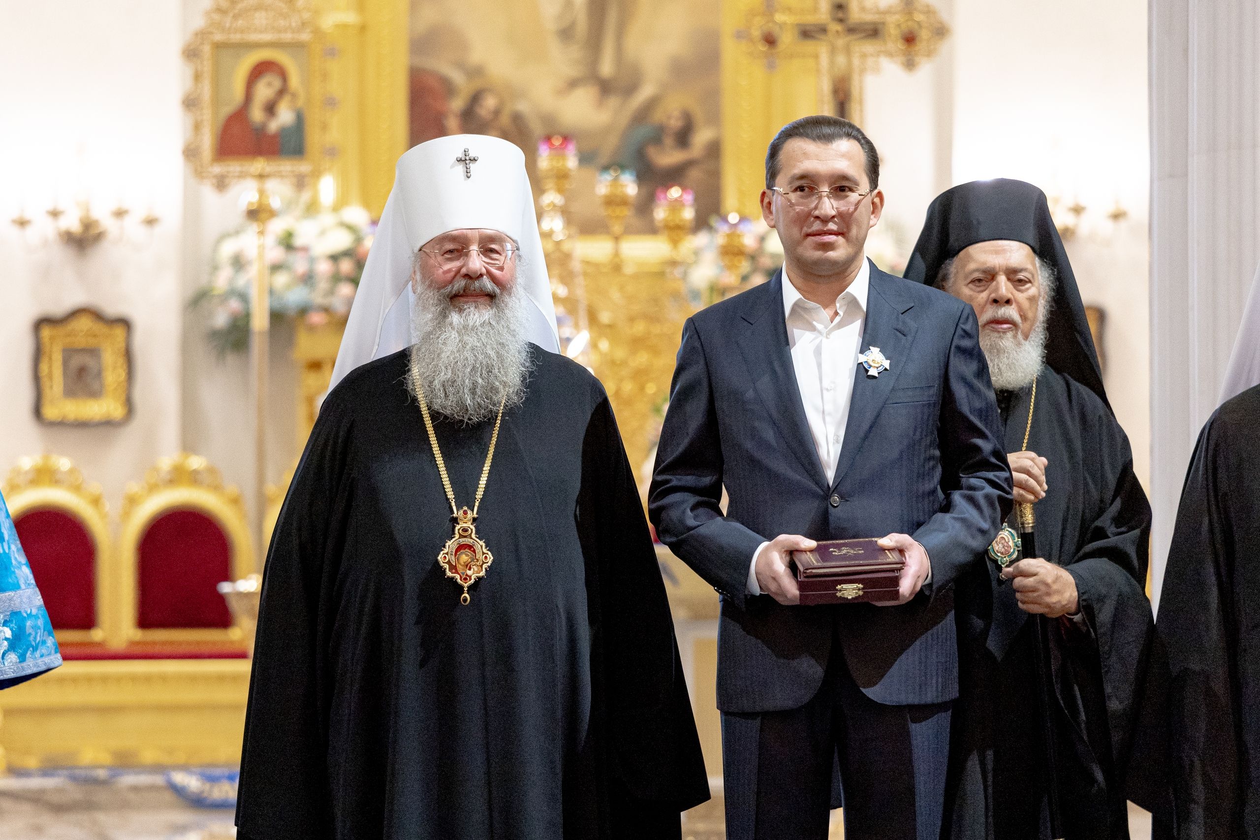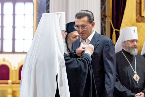 В сегодняшний день я хотел бы передать всем вам, дорогие друзья, братья и сестры, поздравления от нашего Раиса Рустама Нургалиевича Минниханова, с которым мы сегодня беседовали ранним утром. Он поздравил с праздником и просил передать поздравления всем вам, что я и делаю с большой радостью и любовью. Передаю поздравления руководителя нашей Республики, большого друга нашего Святейшего Патриарха Кирилла. Рустам Нургалиевич Минниханов вместе с владыкой Феофаном был инициатором и вдохновителем воссоздания этого замечательного собора. И сегодня при поддержке Раиса восстанавливаются многие святыни нашей Республики, в том числе весь комплекс Казанского Богородицкого монастыря.