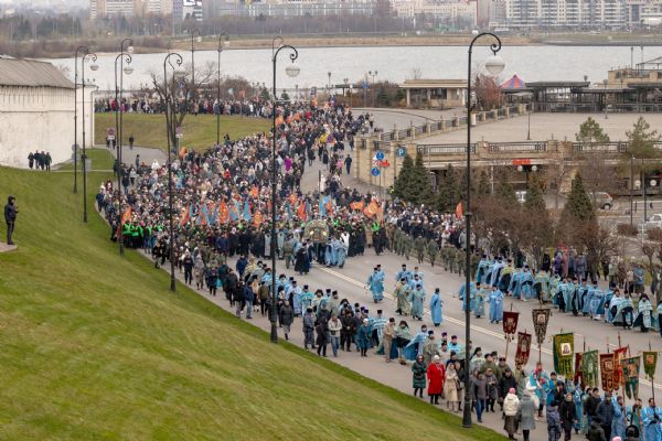 Вместе с архипастырями по историческому центру Казани с чтимым образом Богородицы крестным ходом прошли священнослужители Казанской епархии, жители столицы Татарстана, паломники из разных регионов России.