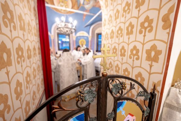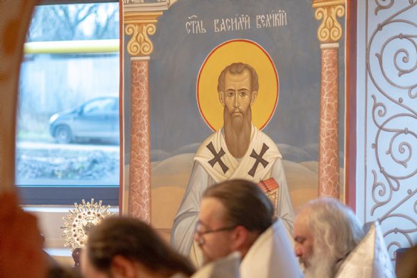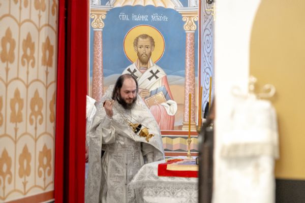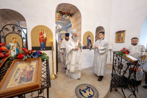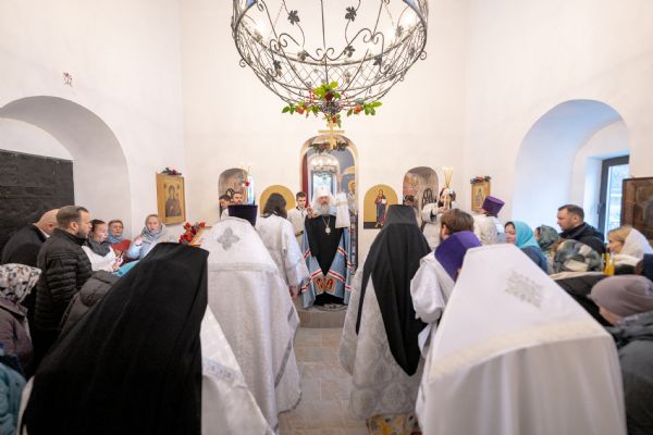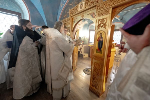 Затем митрополит Кирилл совершил в новоосвященном храме Божественную литургию. На мирной и сугубой ектениях были вознесены молитвы о Российском воинстве и о мире. По запричастном стихе проповедь произнёс иеромонах Роман (Модин).