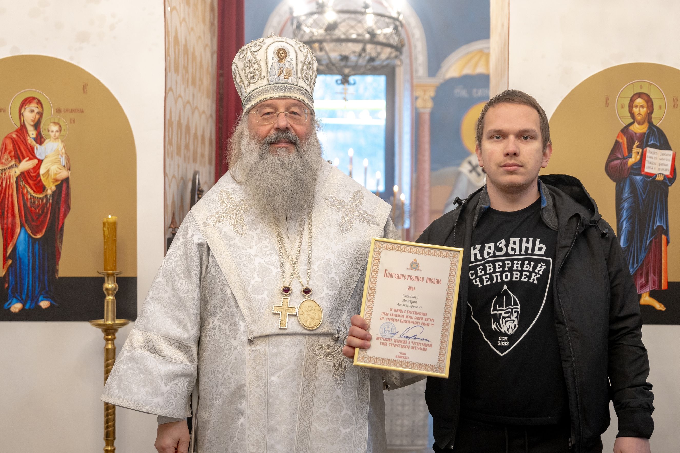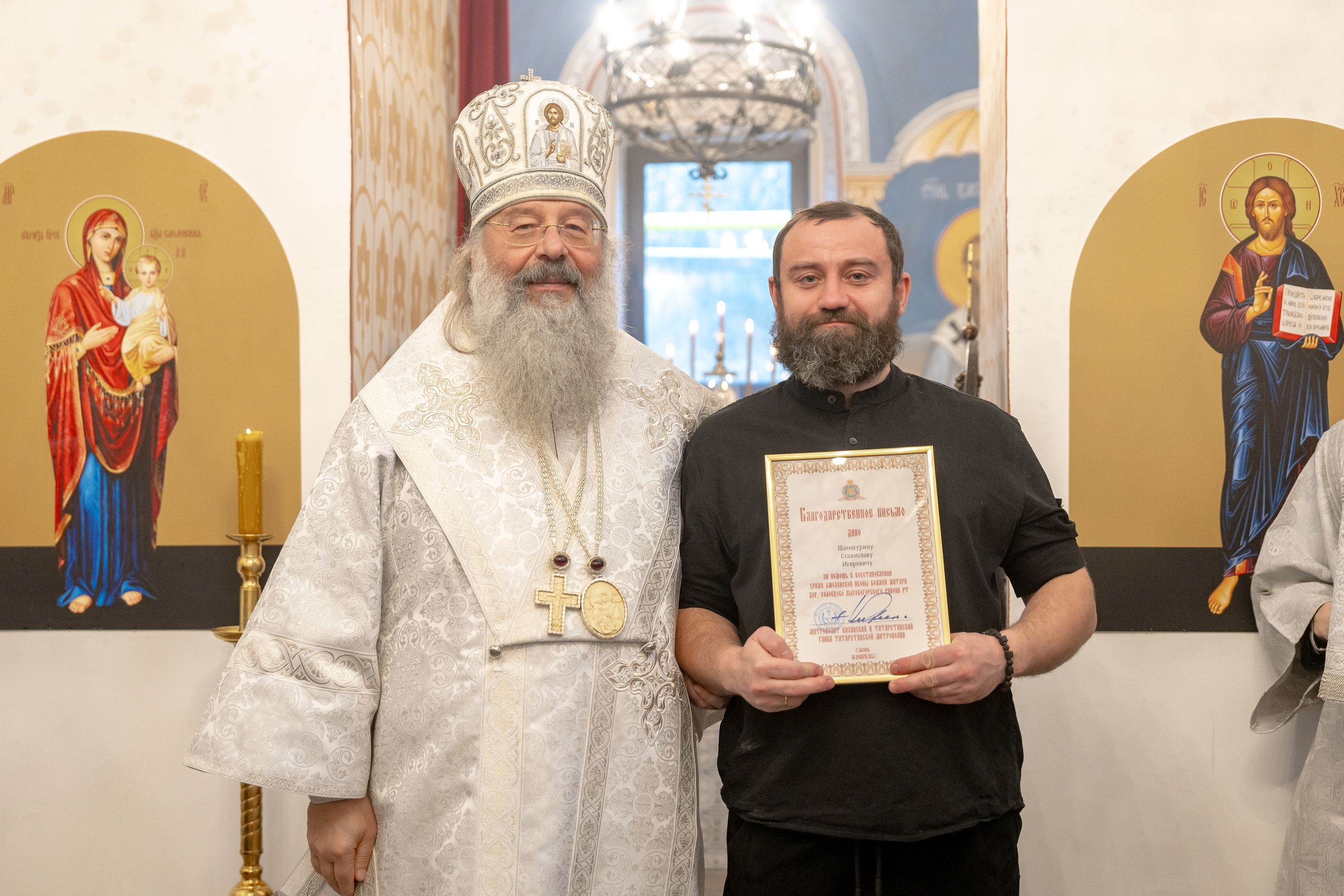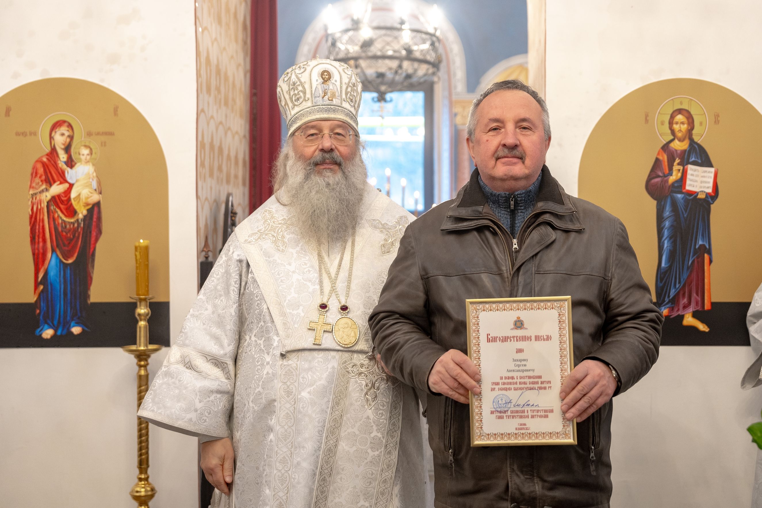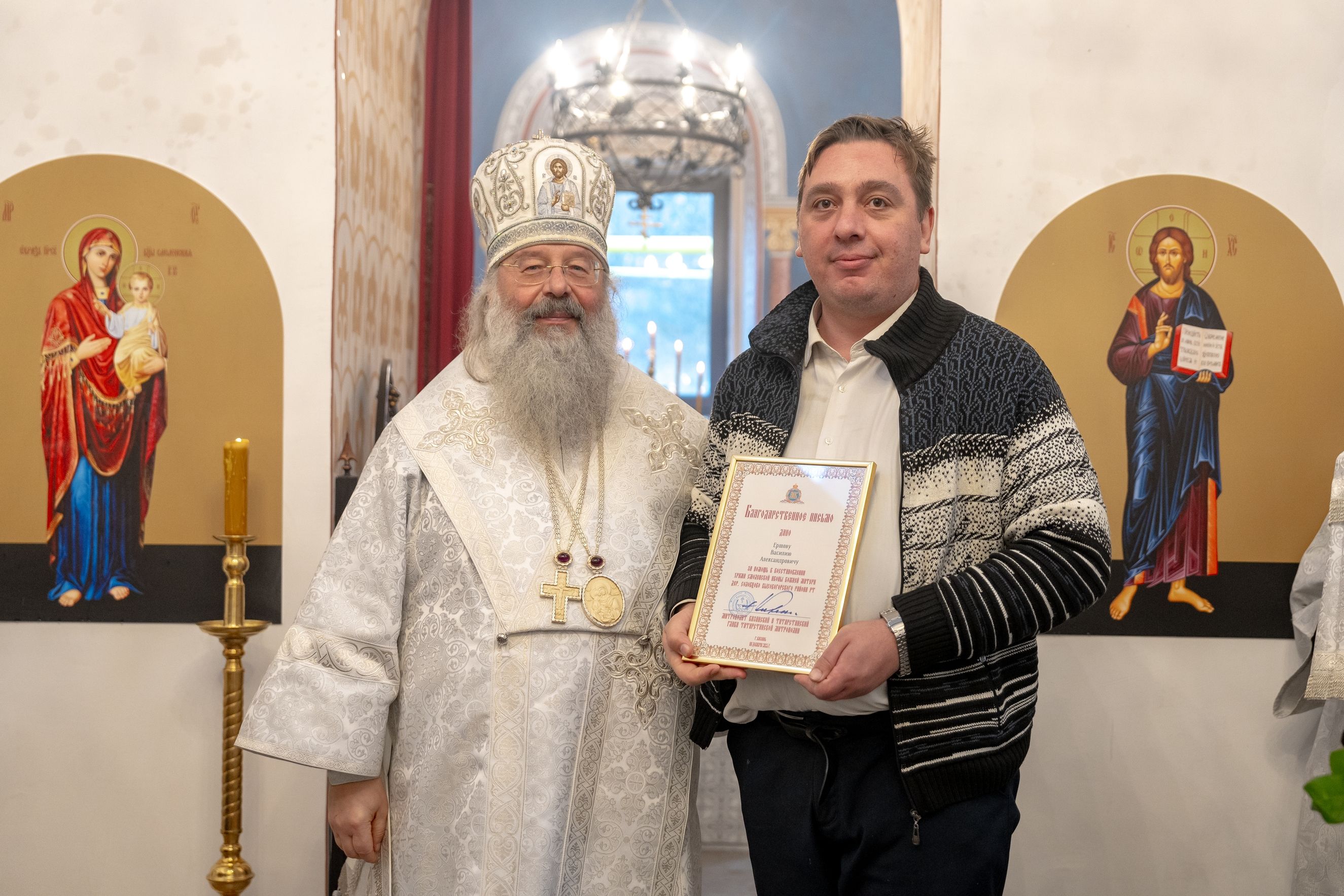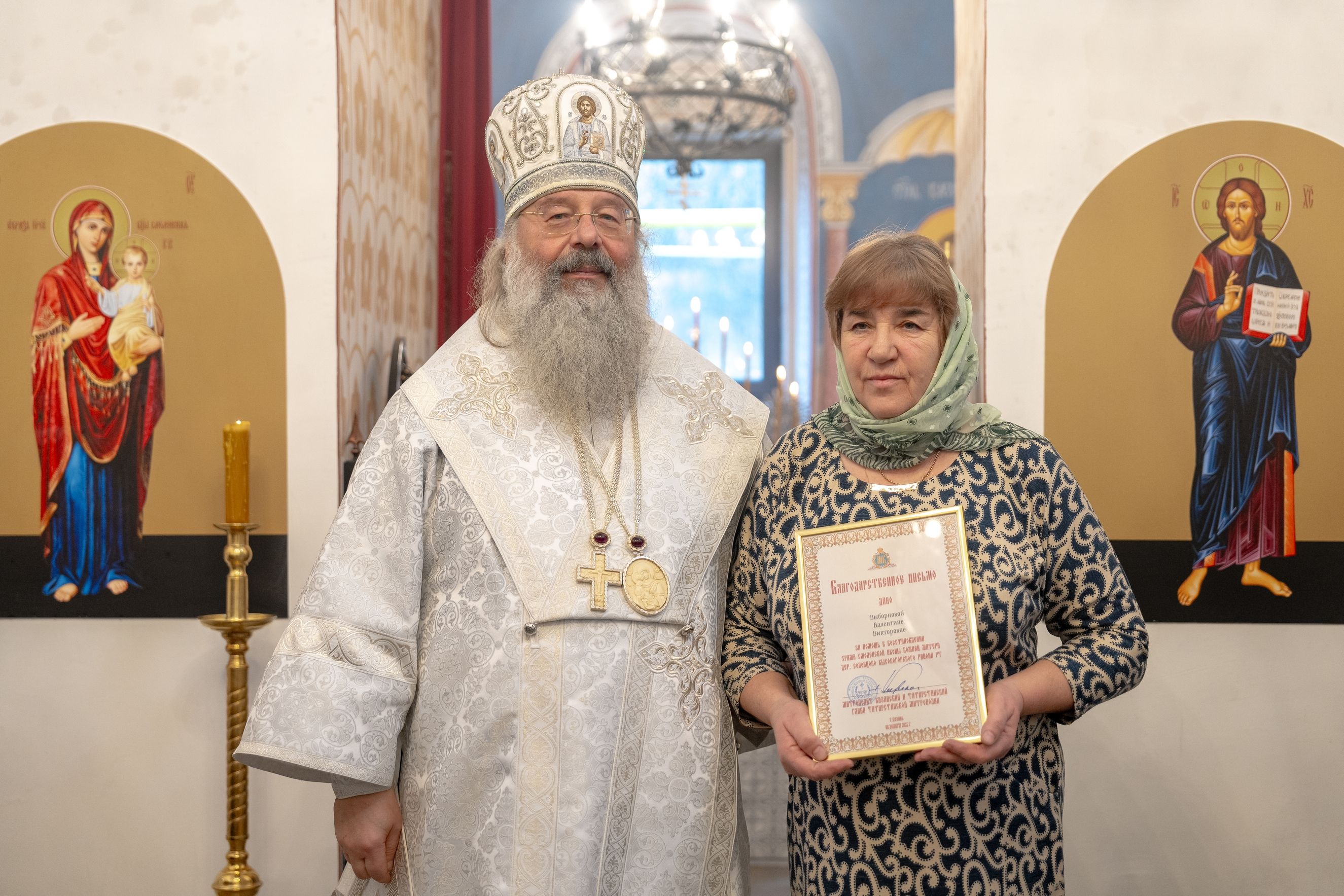 Митрополит Кирилл передал в храм одно из Евангелий, которые Святейший Патриарх Московский и всея Руси Кирилл в ходе Первосвятительского визита в Татарстанскую митрополию благословил раздать новым приходам. На молитвенную память владыка преподнёс приходу Смоленскую икону Божией Матери.