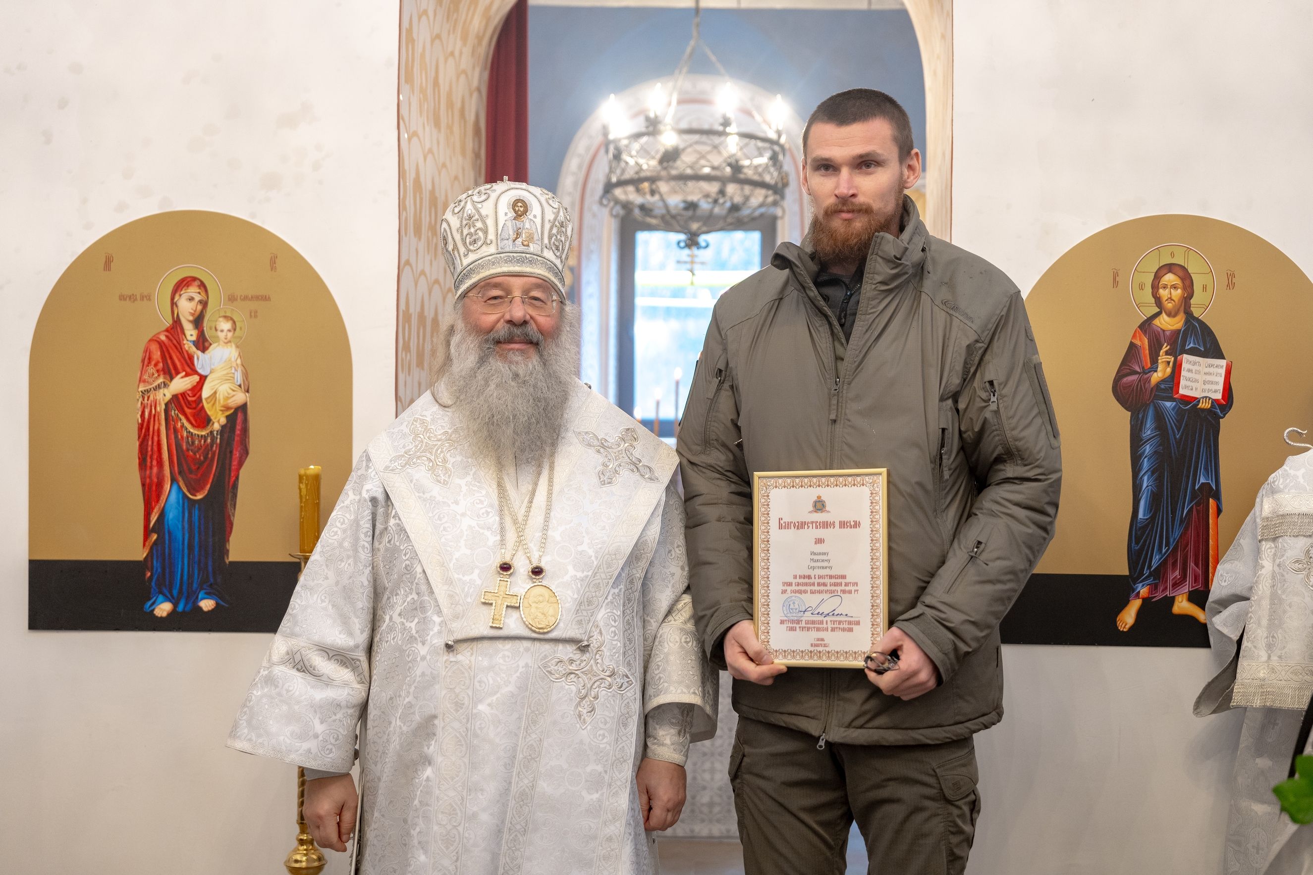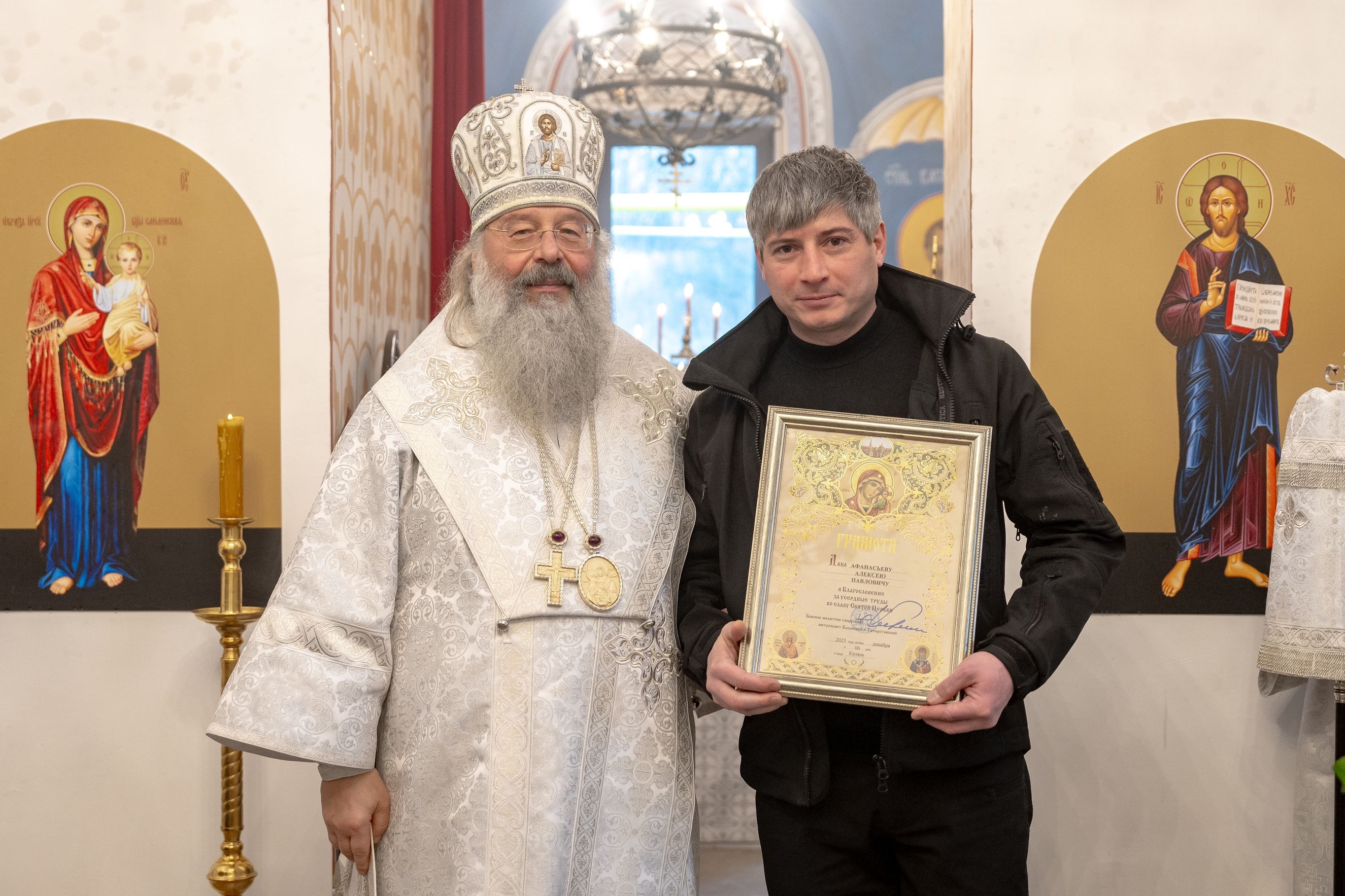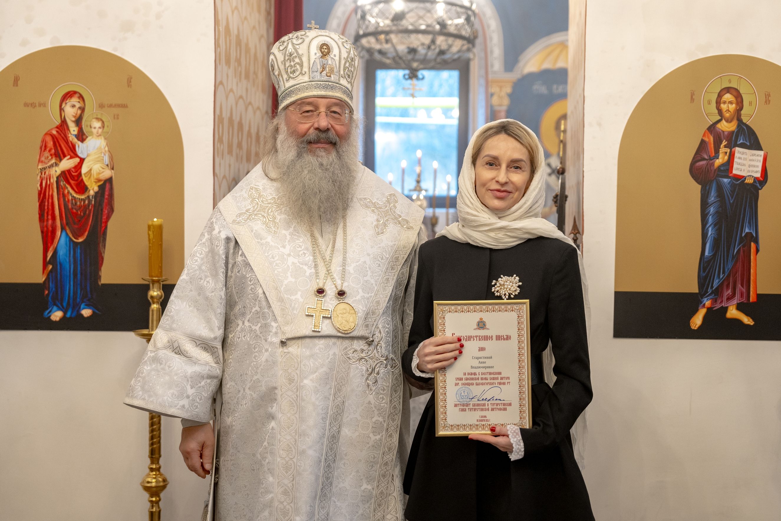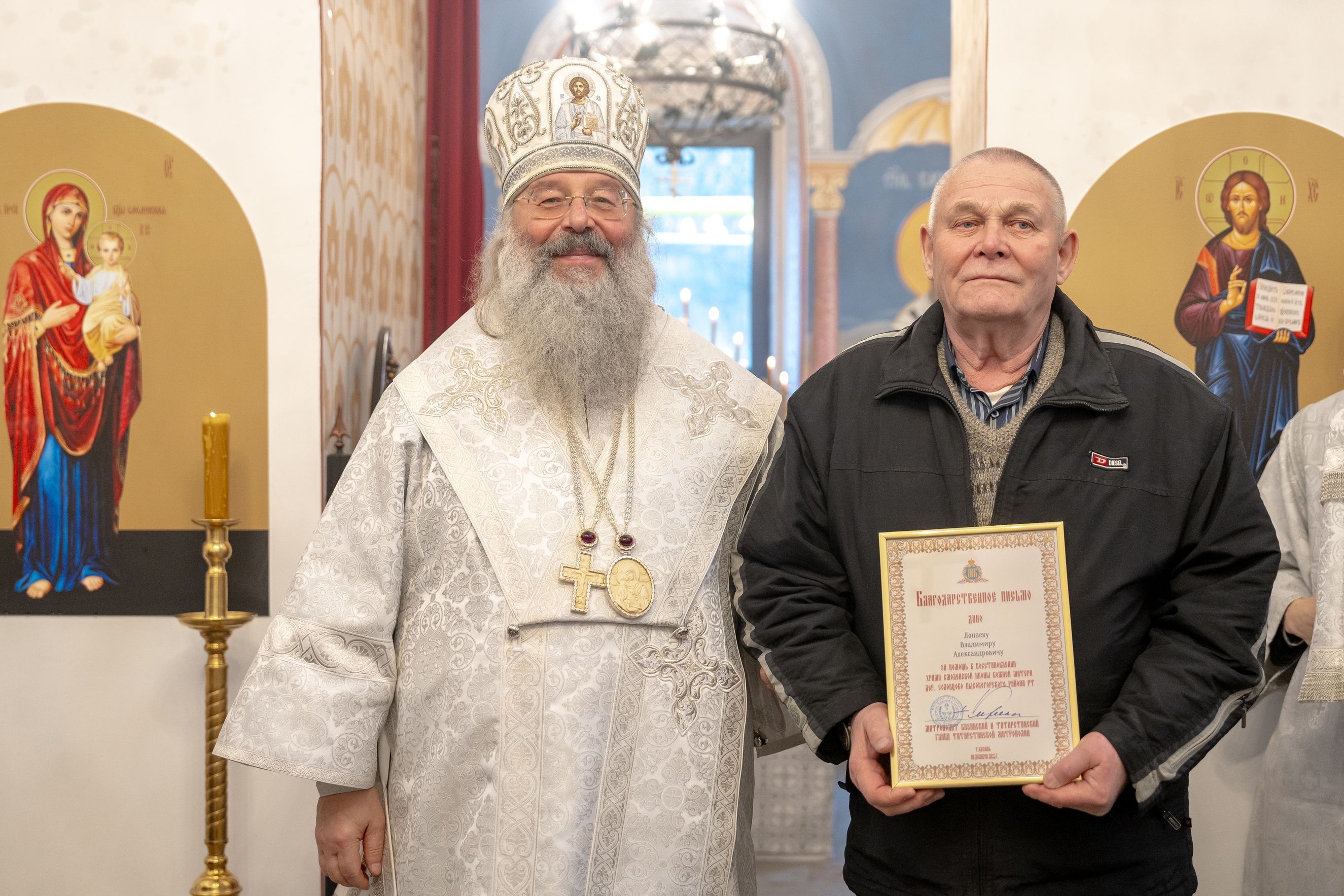 Митрополит Кирилл передал в храм одно из Евангелий, которые Святейший Патриарх Московский и всея Руси Кирилл в ходе Первосвятительского визита в Татарстанскую митрополию благословил раздать новым приходам. На молитвенную память владыка преподнёс приходу Смоленскую икону Божией Матери.