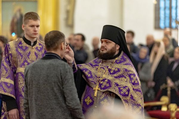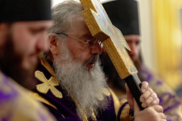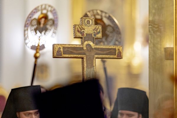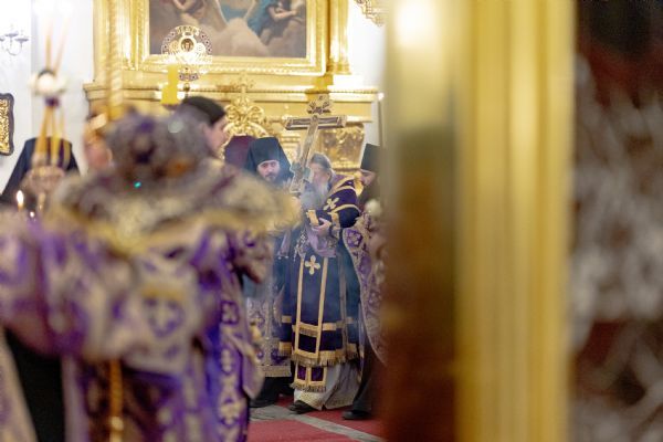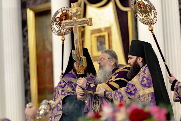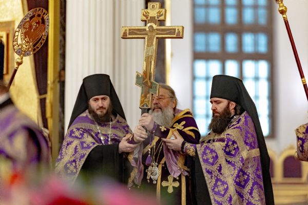 После великого славословия был совершён чин выноса Креста Господня. При пении «Святый Боже…» архипастыри изнесли Крест из алтаря и положили его на центральный аналой для поклонения верующих.