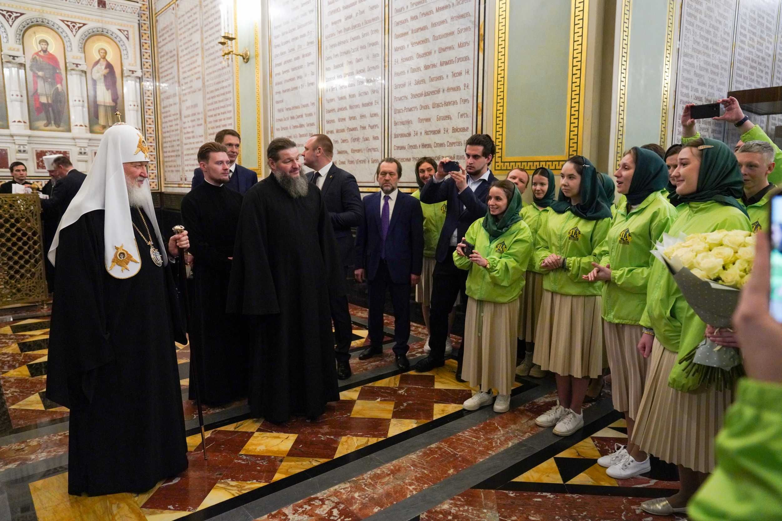 По окончании богослужения Святейшего Владыку поздравили с 50-летием архиерейской хиротонии члены президиума Всемирного русского народного собора и участники движения «Патриаршие добровольцы».
