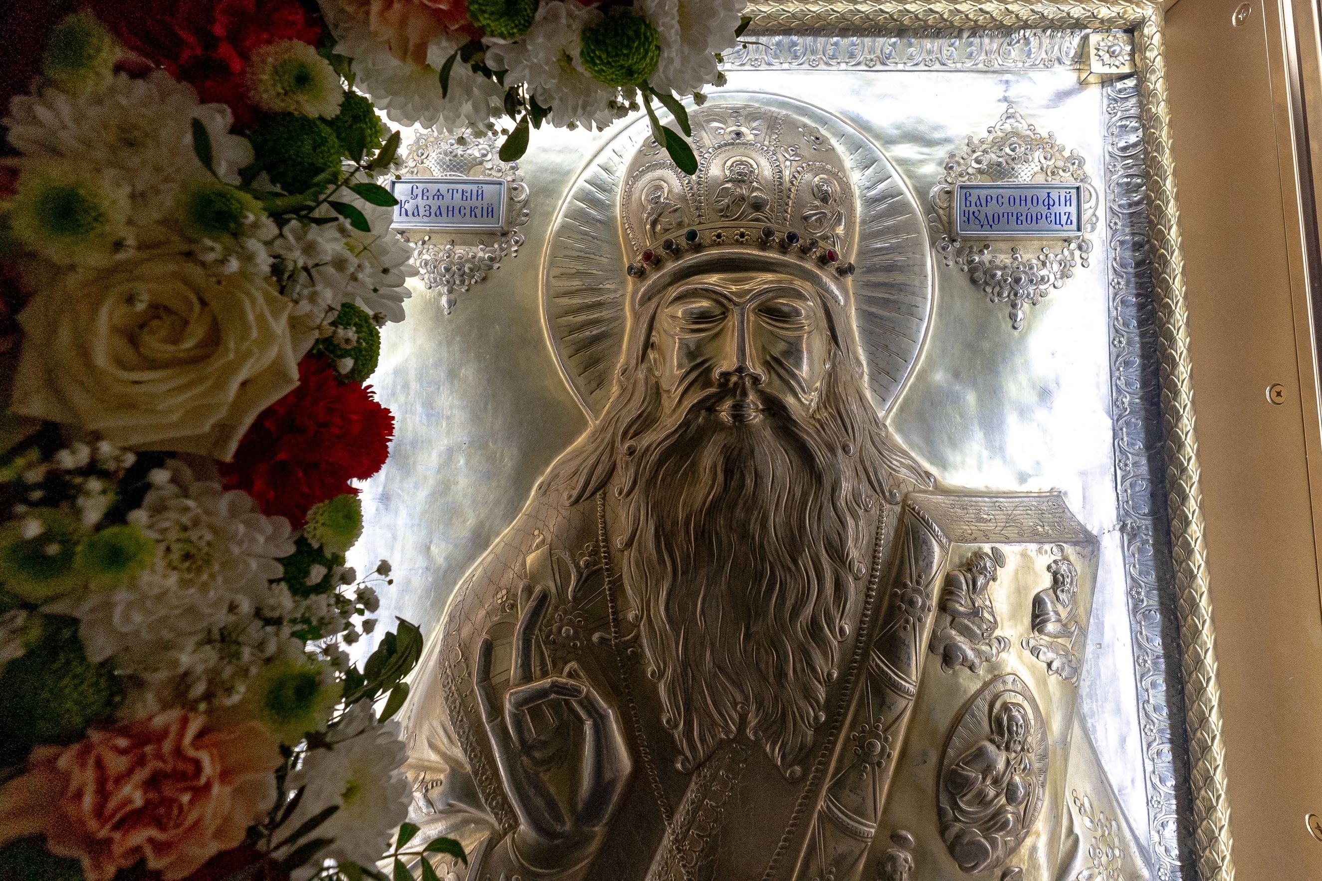 Когда будете вновь прикладываться к его образу, который положен на центральном аналое, обратите внимание, что святитель подписан как Казанский. Да, он был Тверским епископом, но именно в Казани его любят и почитают как своего родного святителя. Надеемся, что святой Варсонофий своим предстательством у Престола Божия утешит каждого, кто в эти дни почитает его память. Храни вас всех Господь. Христос Воскресе!
