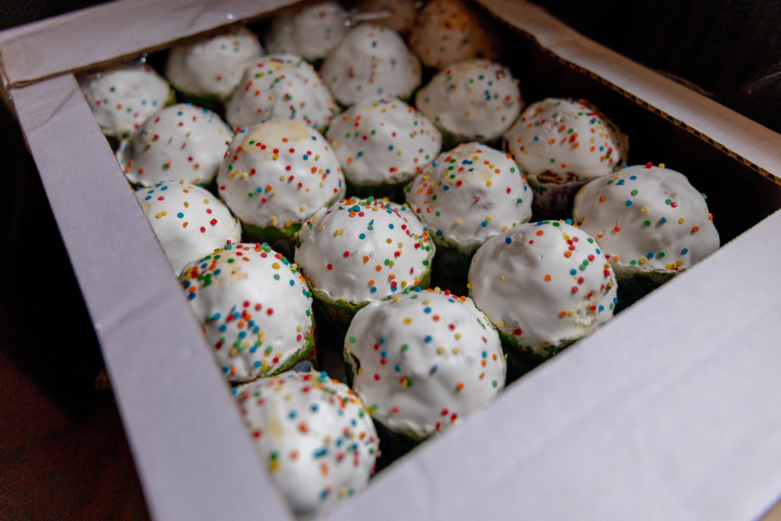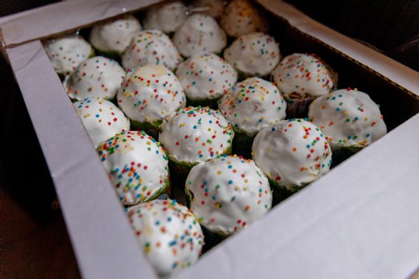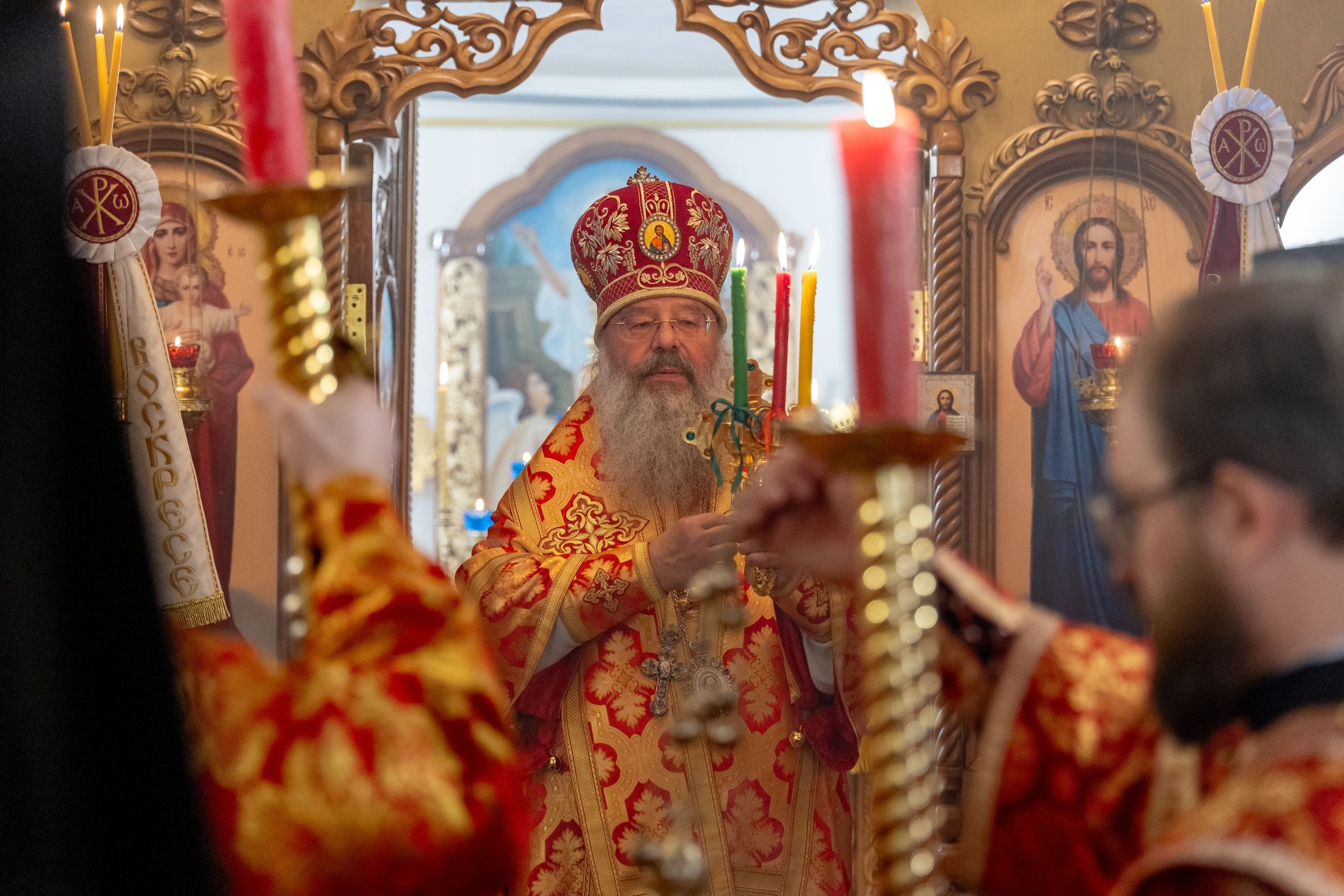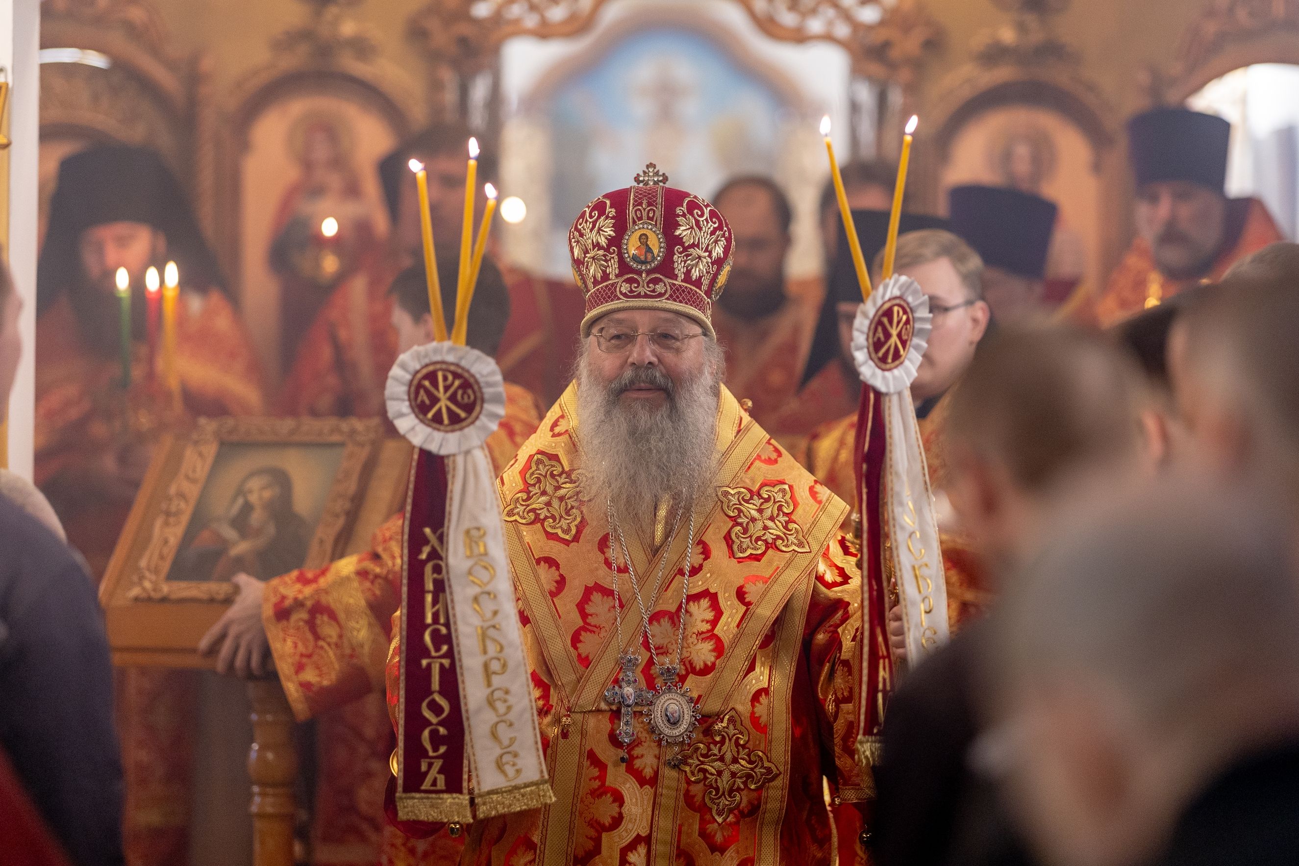 Участникам архиерейского богослужения были розданы иконки святителя Варсонофия Казанского, праздничные открытки и куличи.