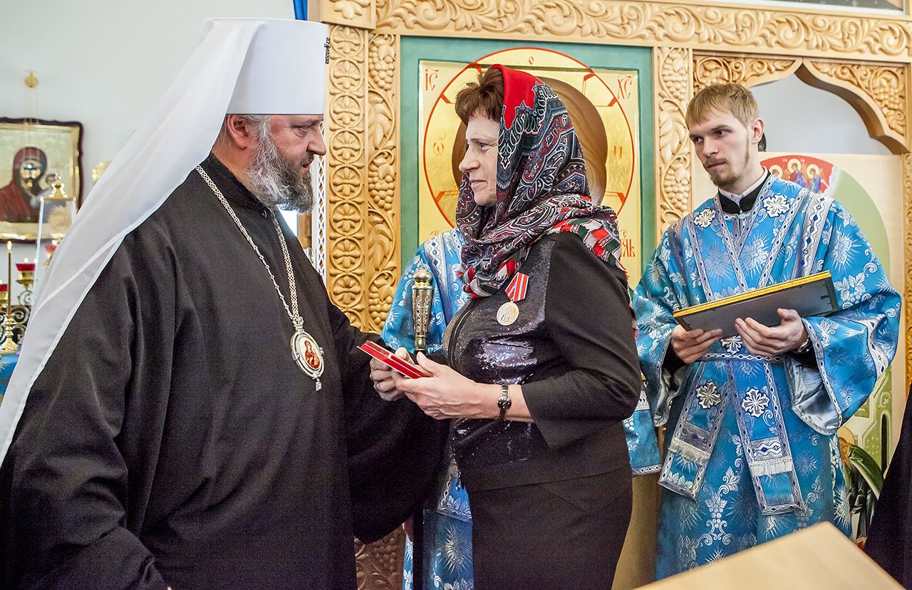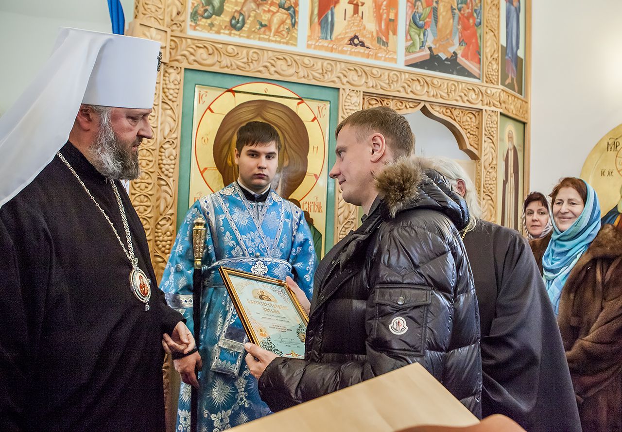 Затем митрополит Аристарх обратился к прихожанам, призвав их участвовать в церковной жизни, а также вручил епархиальные награды активным помощникам и участникам строительства: глава Прокопьевского муниципального района Наталья Григорьевна Шабалина была удостоена медаль «За служение Русской Православной Церкви в Кузбассе» III степени, председатель совета директоров ЗАО «ТопПром» Николай Владимирович Королев — Архиерейской грамоты, а предприниматель Иван Евгеньевич Сазыкин получил Благодарственное письмо.