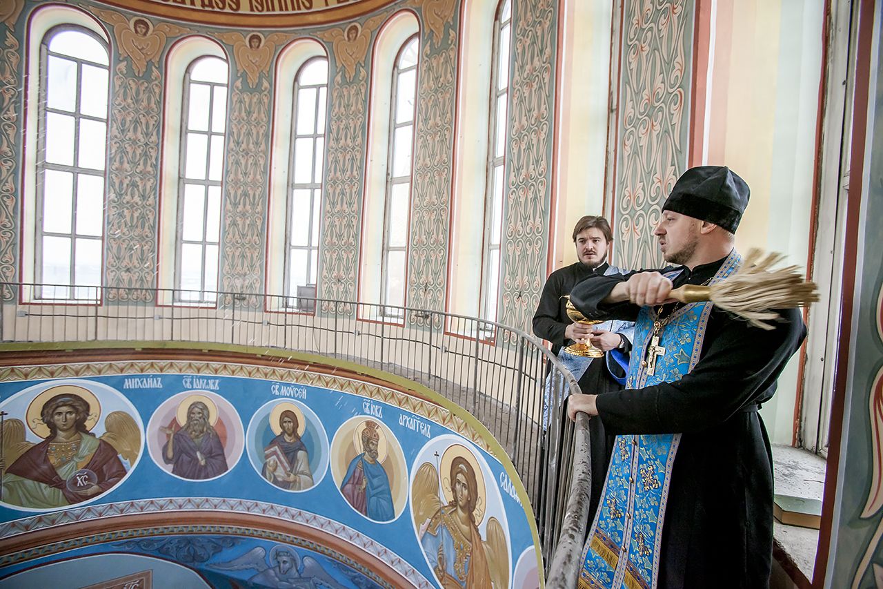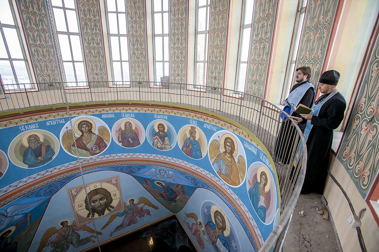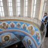 Напомним, что 26 мая по окончании Божественной Литургии и праздничного концерта, которые были посвящены 20-летию со дня освящения кафедрального храма, верхний придел собора был закрыт на достаточно длительный срок, в течение которого кемеровские иконописцы проводили фундаментальные работы по росписи подкупольного пространства. Для этого понадобилось очистить стены от старой росписи, которая за 20 лет потеряла свой первоначальный вид, заново подготовить основание и осуществить саму роспись.