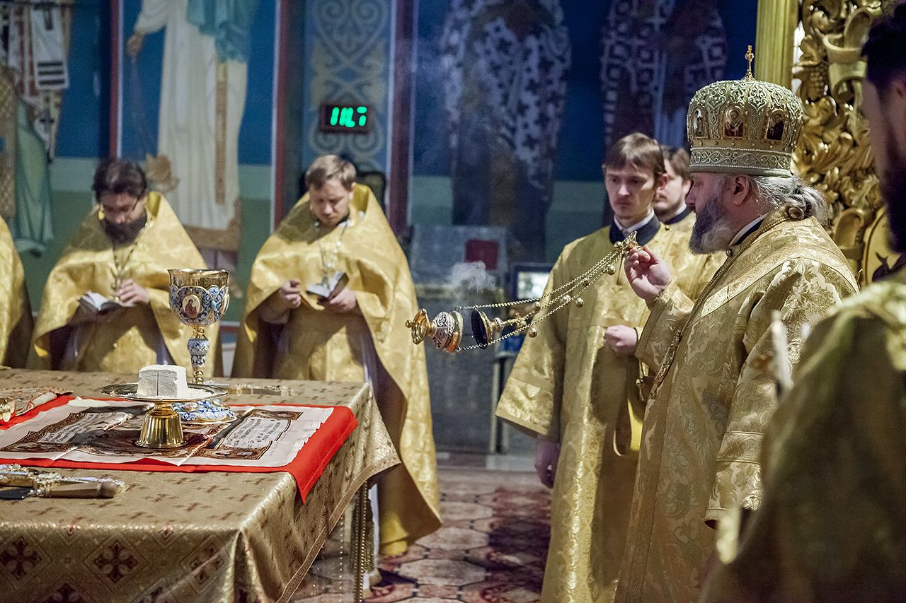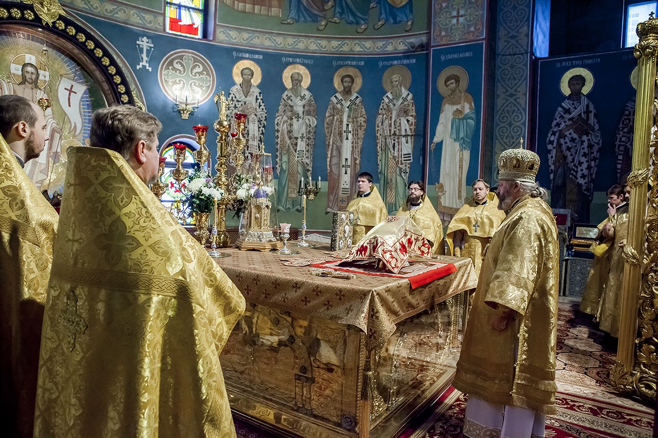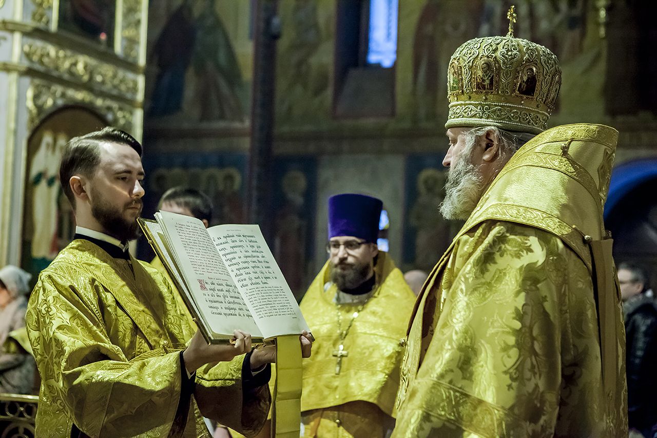 На утрене митрополит прочел отрывок из Евангелия от Луки, повествующий о явлении Воскресшего Спасителя апостолам Луке и Клеопе, а также совершил помазание освященным маслом священнослужителей и прихожан собора, поздравив каждого с наступающим воскресным днем и празднованием памяти святителя Спиридона Тримифунтского.
