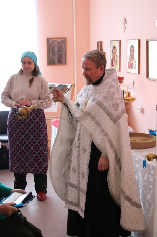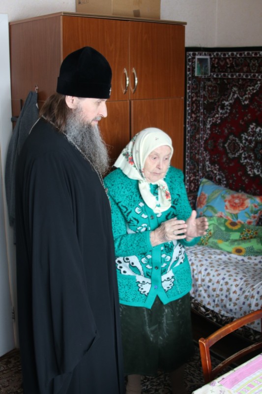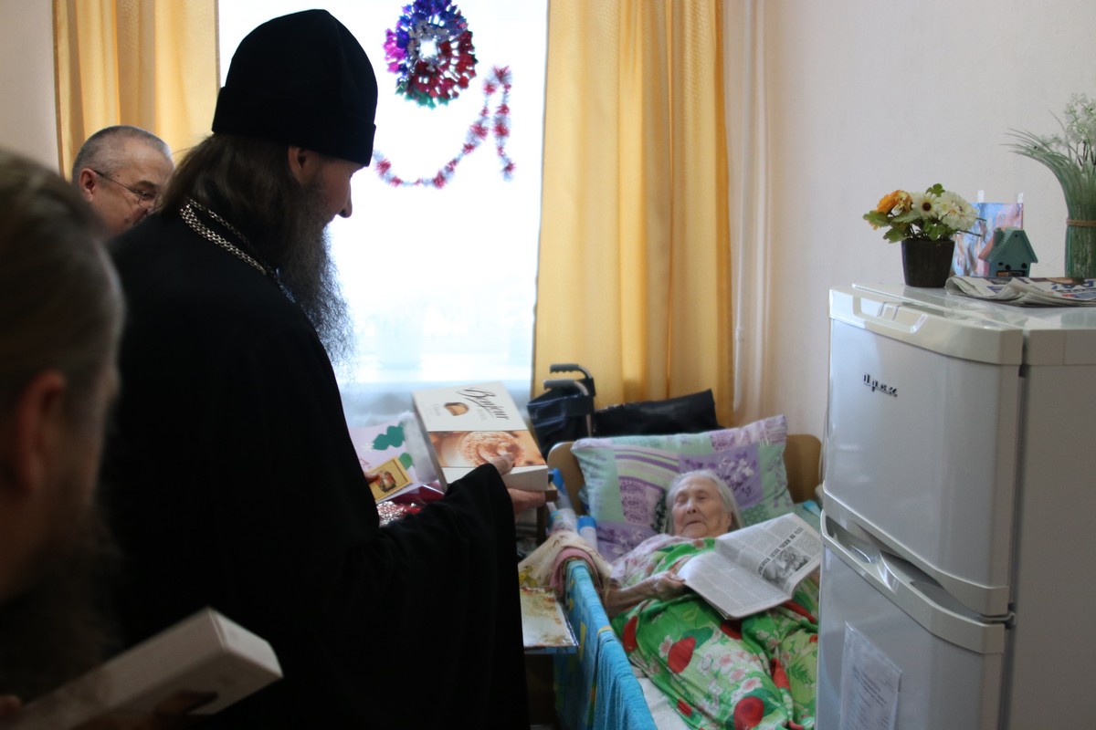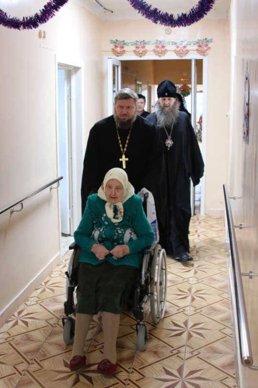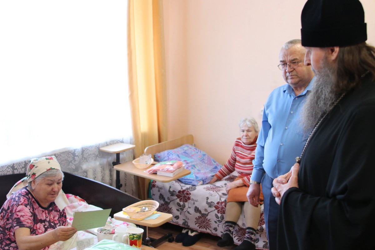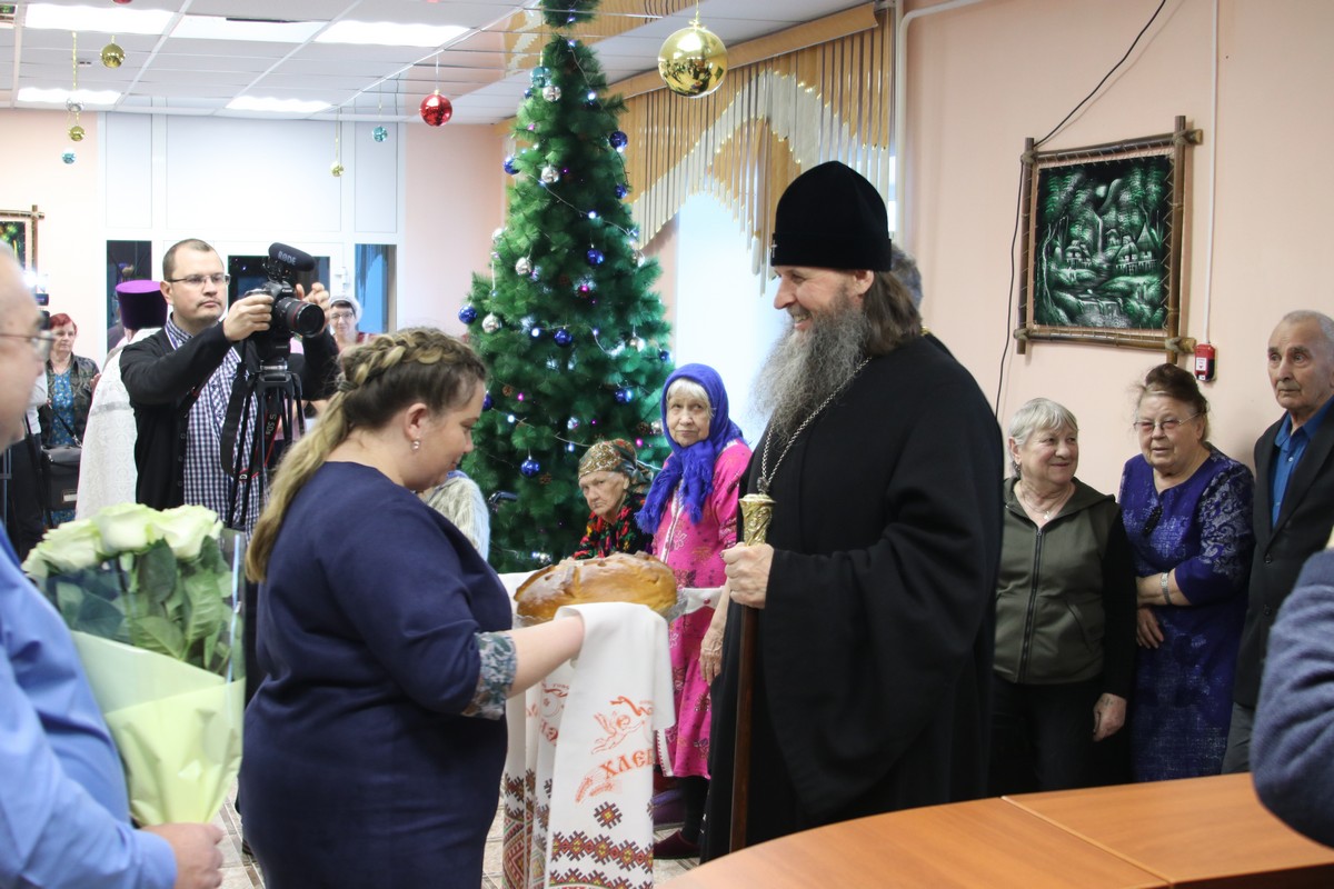Дорогого гостя встретили душевно: хлебом-солью, букетом белых роз от администрации учреждения, корзиной с фруктами от сестёр милосердия, окормляющих интернат; а 90-летняя Таисия Кирилловна Михеева от имени проживающих подарила чётки из янтаря. Она попросила владыку зайти к ней в комнату, где уже было всё приготовлено для чина освящения жилища, и архипастырь выполнил просьбу Таисии Кирилловны – освятил её комнату.
