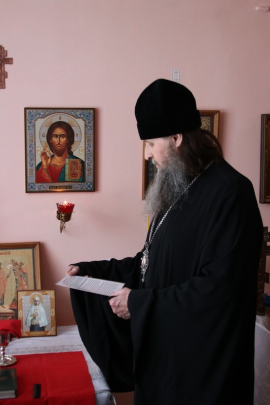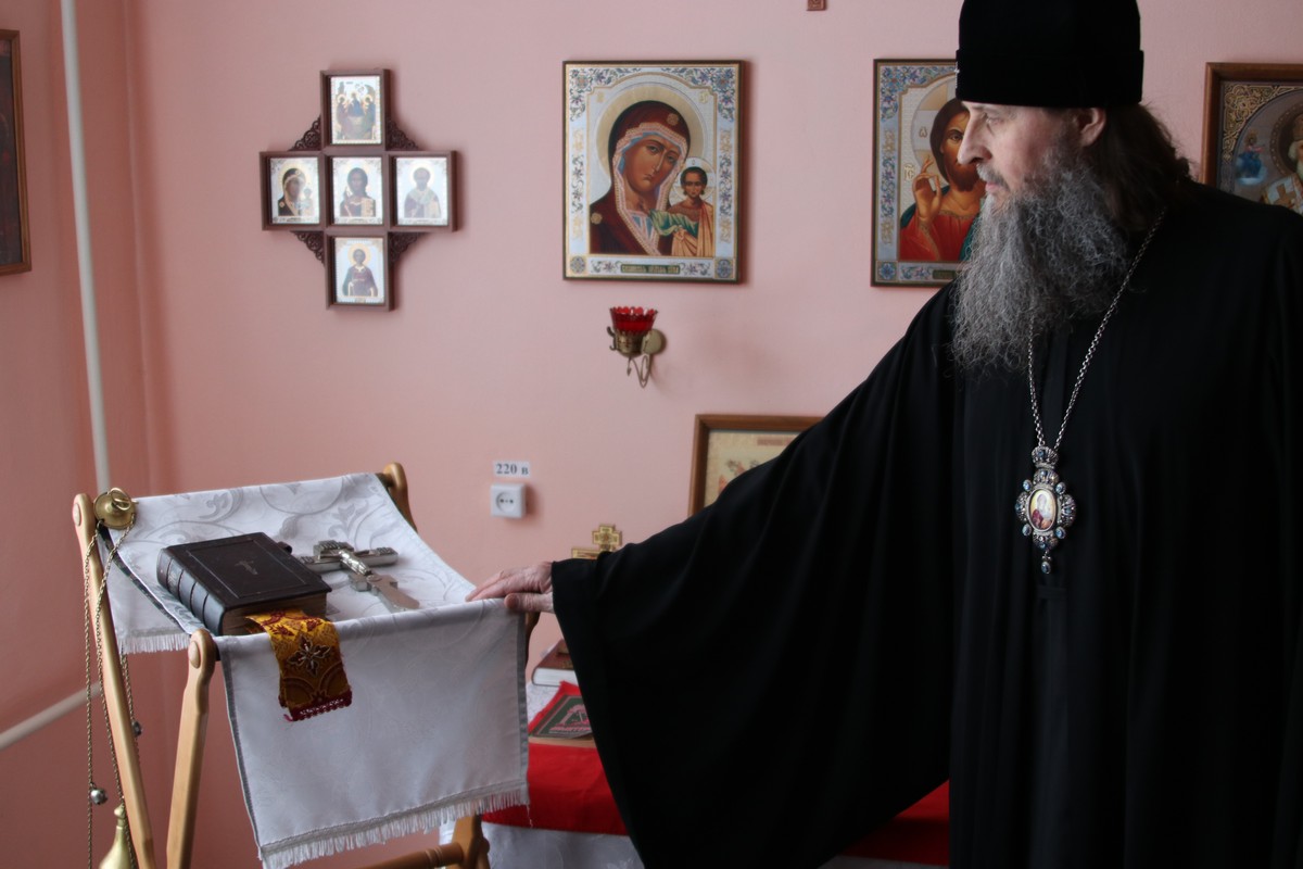 Затем митрополит Даниил в сопровождении хозяев посетил молельную комнату в честь святителя Луки, которая появилась в интернате благодаря стараниям руководителя епархиального отдела церковной благотворительности и социального служения протоиерея Владимира Алексеева. Здесь есть всё необходимое для совершения молебнов, акафистов и церковных таинств. Протоиерей Алексий Смирнов, уже 20 лет окормляющий интернат, рассказал, что бывает здесь два раза в неделю: в четверг в молельной комнате после молебна исповедует и причащает ходячих проживающих, в пятницу обходит палаты с лежачими и причащает их там.