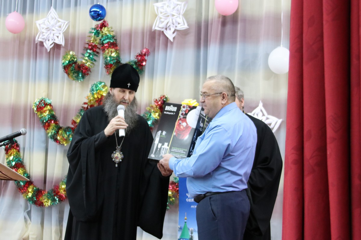 Девочки-ведущие первое слово представили митрополиту Даниилу, который обратился к проживающим со словами участия и ободрения. От епархии владыка подарил администрации учреждения блендер и календарь «Чимеевская святыня».