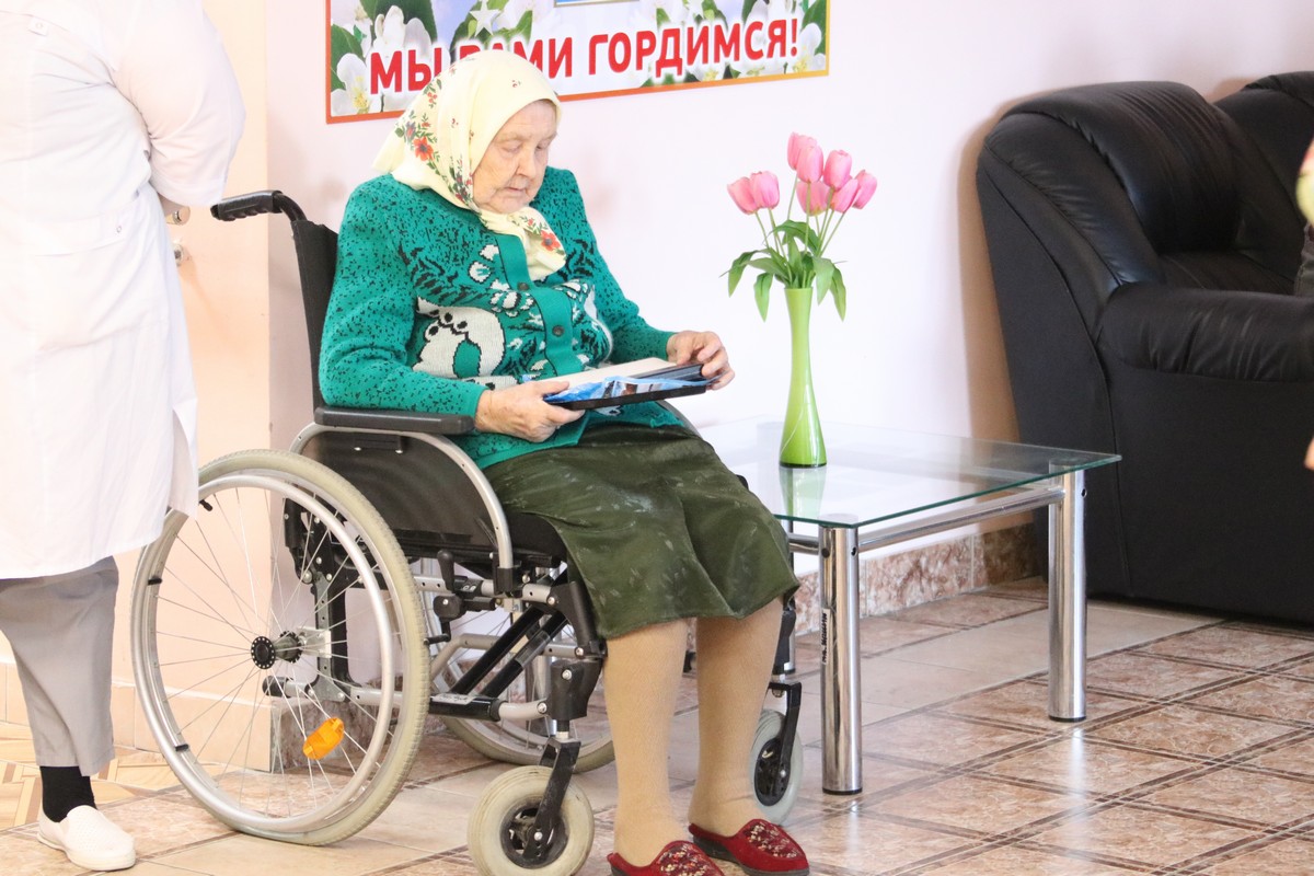 Одна из сопровождавших высокого гостя сестёр милосердия – Наталья Леонидовна Архипова – регулярно навещает интернат с 2014 года, поэтому многих пациентов знает лично: «Вот Дина Фёдоровна, ей 91-й год, но она постоянно читает, её без книжки в руках не застанешь; а вот Нина Фёдоровна, у неё на днях день рождения был, видите – цветы в палате?». А отец Алексий Смирнов добавил, что Дина Фёдоровна является его прихожанкой все 20 лет работы в интернате.