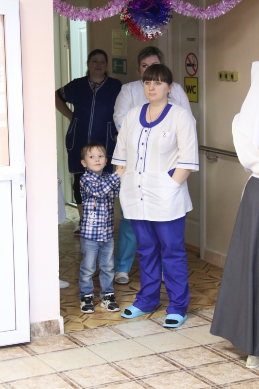 Затем митрополит Даниил обошёл все палаты первого отделения милосердия. По словам старшей медсестры Екатерины Кашеевой, здесь 29 самых тяжелых пациентов – после инсультов и инфарктов, возраст от 70 до 98 лет. Каждый из них получил сладкий подарок, полотенце, икону святителя Николая и красивую открытку, сделанную воспитанниками воскресной школы Порт-Артурского храма. Владыка каждому пациенту сказал добрые слова, поздравил со Святочными днями, а с бывшей учительницей 80-летней Риммой Павловной даже поговорил по-немецки.
