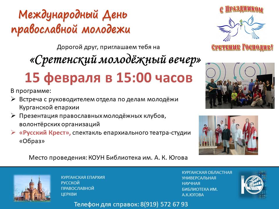 15 февраля Курганская епархия приглашает молодых людей (парней и девушек, леди и джентльменов, дам и господ, братьев и сестер) в возрасте от 16 до 35 лет (школьников, студентов, работающую и неработающую молодежь), желающих участвовать в жизни Церкви или начать знакомство с ней, в библиотеку имени Югова на встречу в честь Дня православной молодежи.