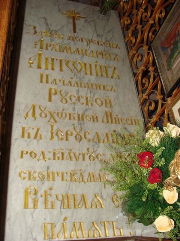 Этот вынос и несение гроба к месту вечного упокоения представляло собою особенно величественную и трогательную картину. Согласно воле покойного, могила для его гроба была приготовлена на Елеонской горе, в устроенной им церкви русской миссии, находящейся на самой вершине этой священной горы. Далекий, трехверстный путь от соборного храма миссии до храма на Елеонской горе, путь совершенно открытый, так как пролегает на дороге, окружающей город, во время движения по нему похоронной процессии, был покрыт группами разноплеменных людей, собравшихся со всего Иерусалима посмотреть на погребение всем известного и уважаемого Архимандрита. Медленное движение похоронной процессии продолжалось, при лучах заходящего солнца, почти два часа. В конце 6-го часа процессия достигла Малой Галилеи и была встречена здесь преосвященнейшим Епифанием, митрополитом Иорданским, который совершил здесь литию <…> и сопровождал гроб далее в церковь на Елеонской горе.