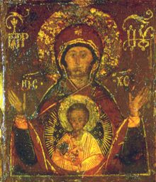 Икона Божьей Матери, именуемая «Знамение», изображает Пресвятую Богородицу, сидящую и молитвенно поднявшую Свои руки; на ее груди, на фоне круглого щита (или сферы) благословляющий Божественный Младенец – Спас-Эммануил. Такое изображение Богоматери относится к числу самых первых Ее иконописных образов. В усыпальнице святой Агнии в Риме есть изображение Богоматери с распростертыми в молитве руками и с Младенцем, сидящим на Ее коленях. Это изображение относится к IV веку. Кроме этого, известен древний византийский образ Богоматери «Никопеи», VI века, где Пресвятая Богородица изображена сидящей на троне и держащую обеими руками перед собой овальный щит с образом Спаса-Эммануила.