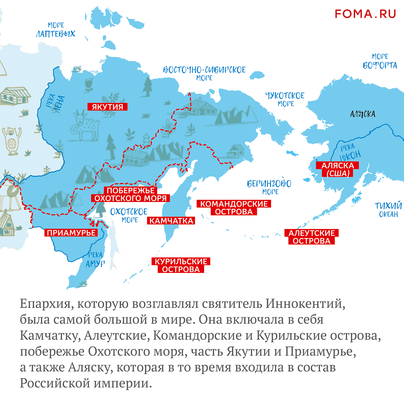 Его епархия была самой большой в мире и включала в себя Камчатку, Аляску, Алеутские, Командорские и Курильские острова, побережье Охотского моря, часть Якутии и Приамурье. Чтобы добраться до всех поселков, стойбищ, островов, которые он окормлял, святитель преодолевал огромные расстояния. По землям, где никогда не было дорог. По вечной мерзлоте. По рекам, морям и океанам. Он пережил настоящие шторма и кораблекрушения. Совершил кругосветное путешествие, обогнув Южную Америку и доплыв с Аляски до Санкт-Петербурга через два океана.
