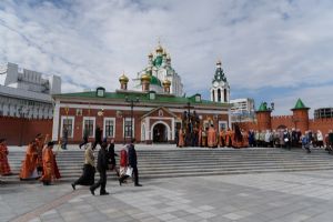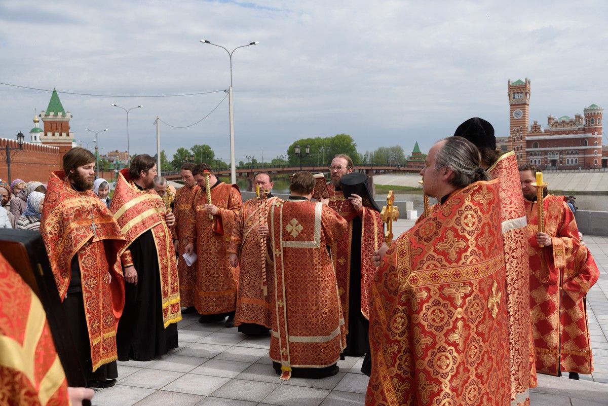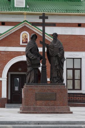Прихожане трех городских храмов: собора Воскресения Христова, собора Вознесения Господня и собора Благовещения Пресвятой Богородицы вместе с настоятелями и духовенством после Божественной литургии пришли крестным ходом к памятнику святых Кирилла и Мефодия.
