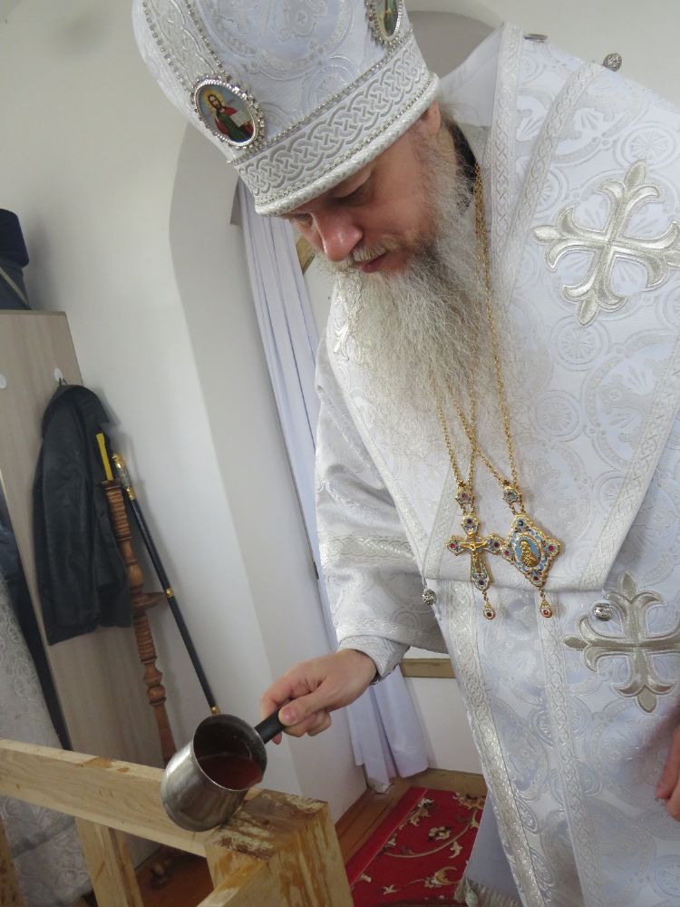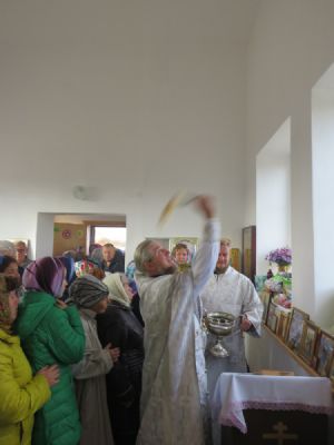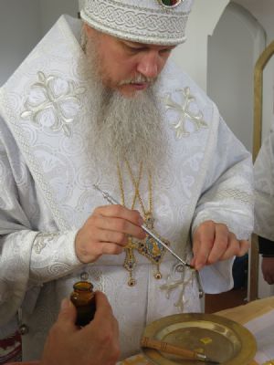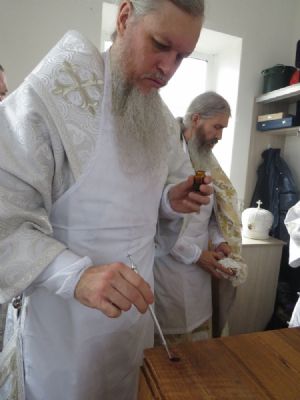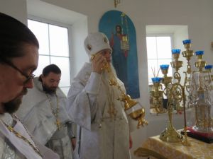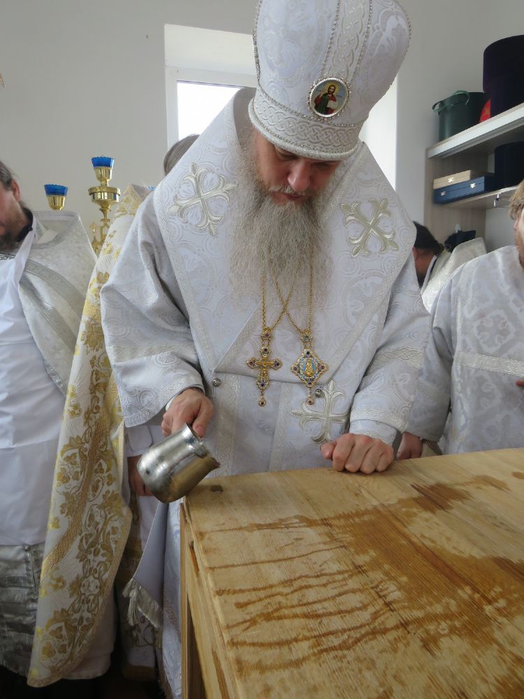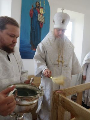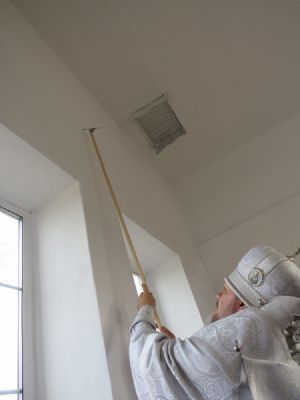 После освящения престола освящается и весь храм каждением, молитвою, кроплением святой водою и миропомазанием крестообразно стен, сперва над горним местом, потом над вратами — западными, южными и северными.