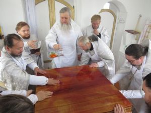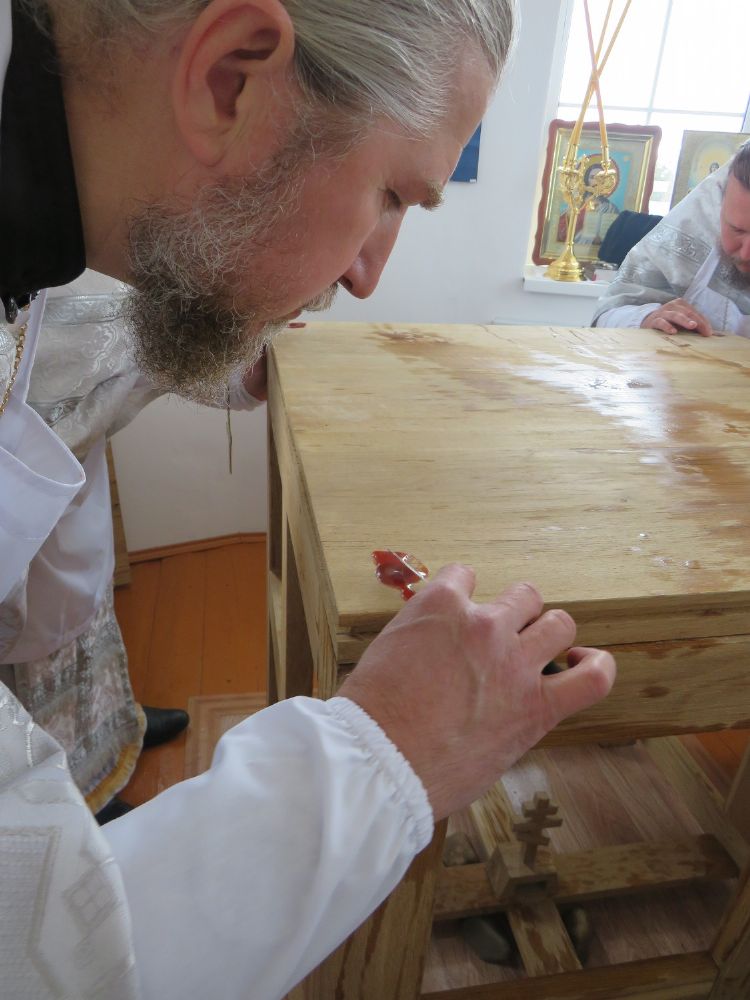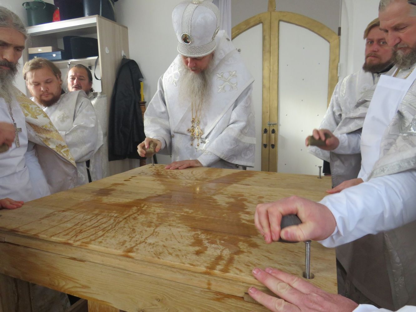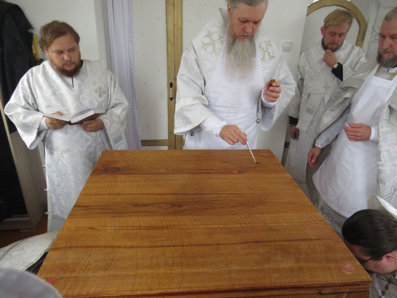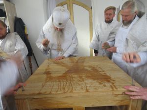 После краткой молитвы о том, чтобы Господь сподобил неосужденно совершить освящение храма, архиерей окропляет святой водою верхнюю доску престола с обеих сторон ее, и она полагается на престольных столпах. Потом архиерей окропляет четыре гвоздя и, вложив их в углы престола, с помощью священнослужителей закрепляет доску на престольных столпах камнями.