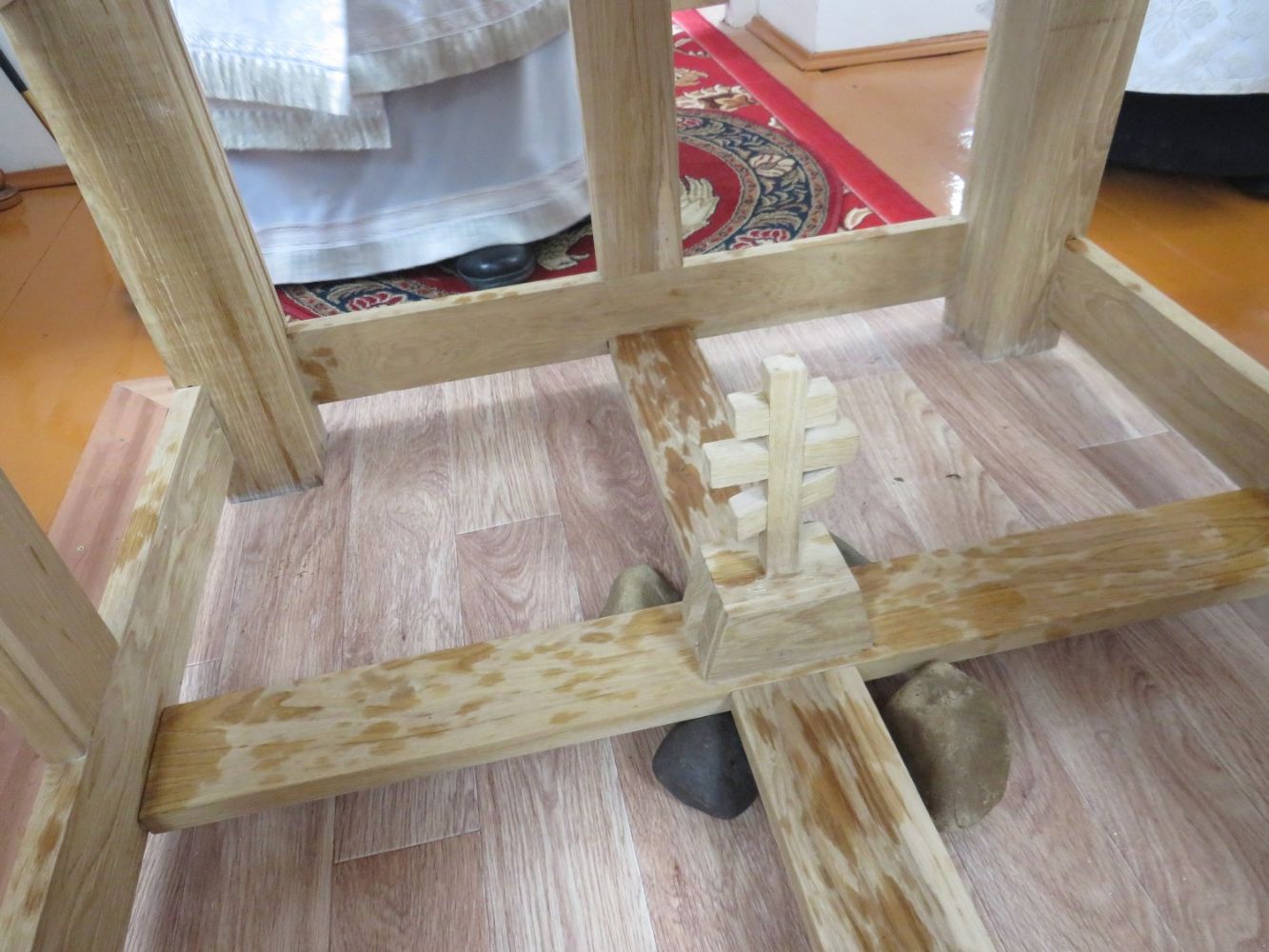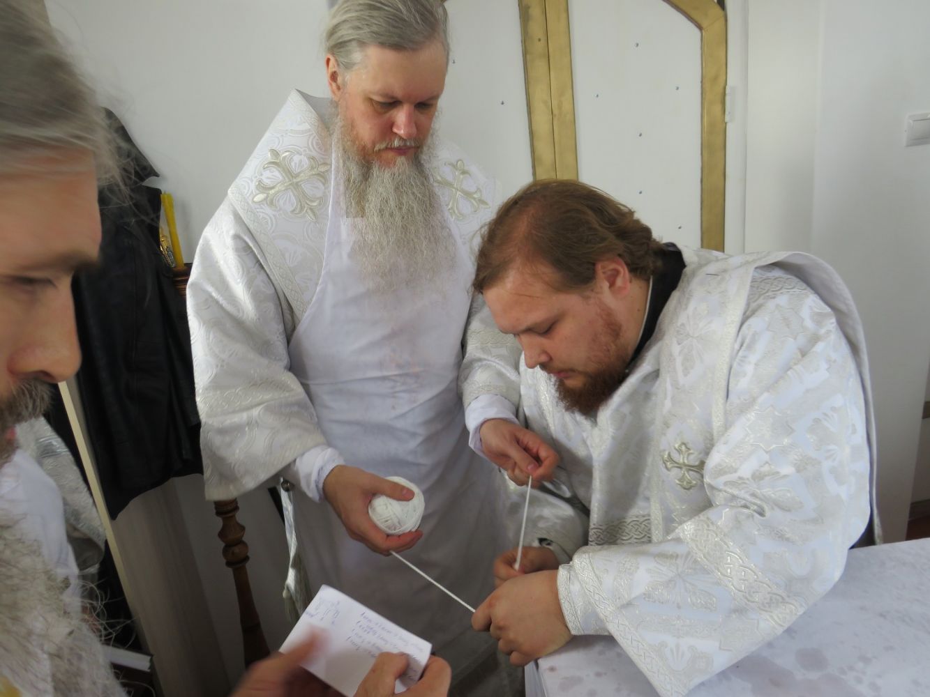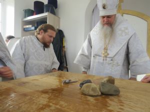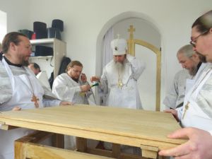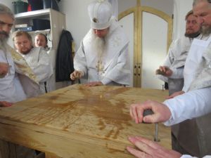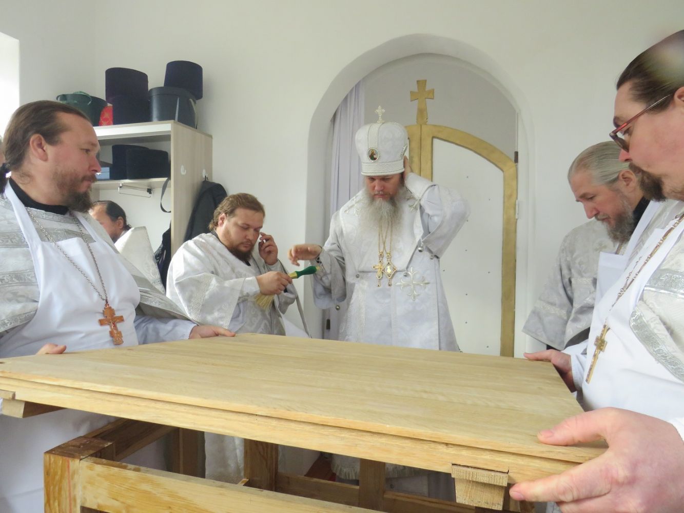 После краткой молитвы о том, чтобы Господь сподобил неосужденно совершить освящение храма, архиерей окропляет святой водою верхнюю доску престола с обеих сторон ее, и она полагается на престольных столпах. Потом архиерей окропляет четыре гвоздя и, вложив их в углы престола, с помощью священнослужителей закрепляет доску на престольных столпах камнями.