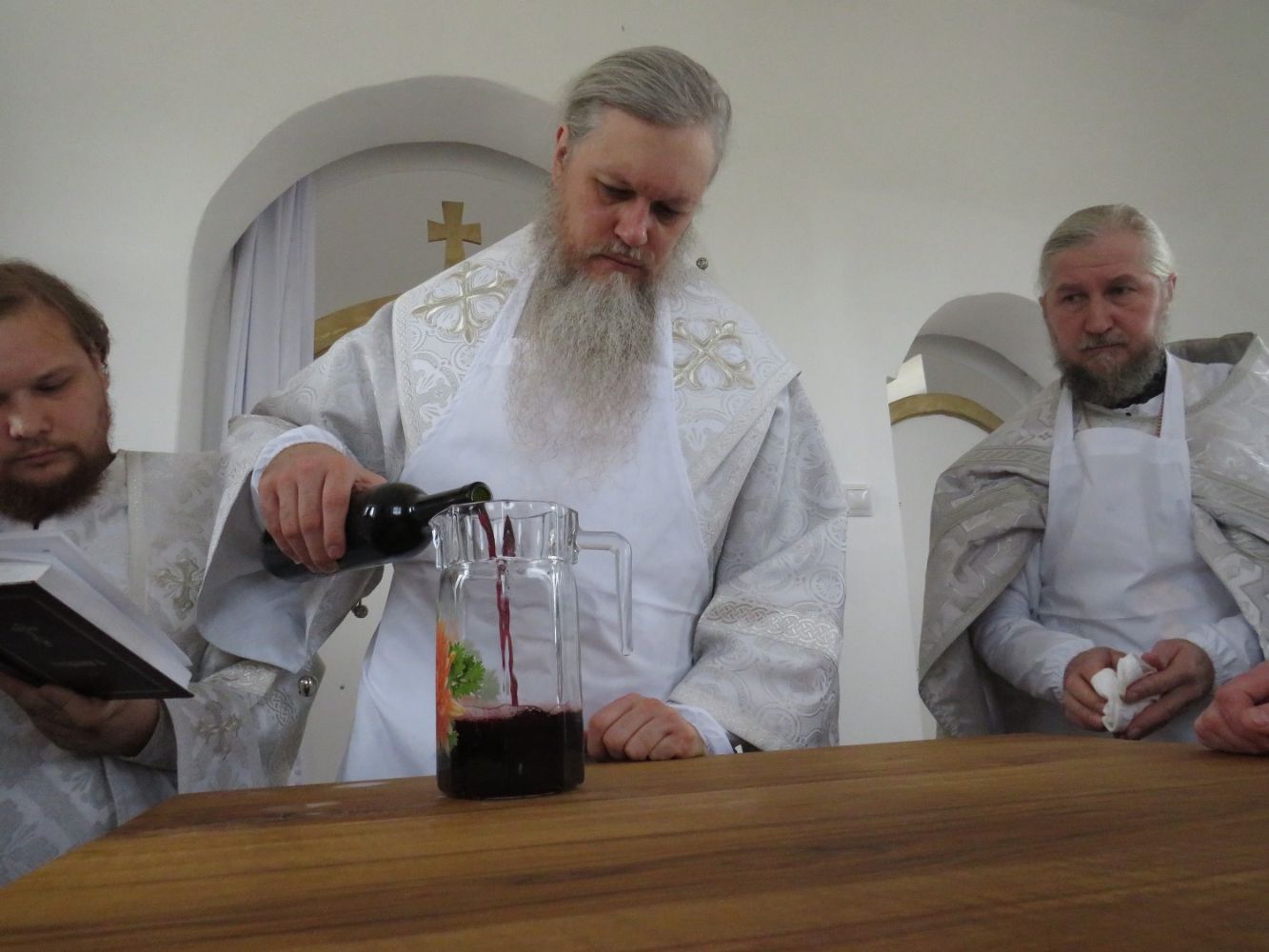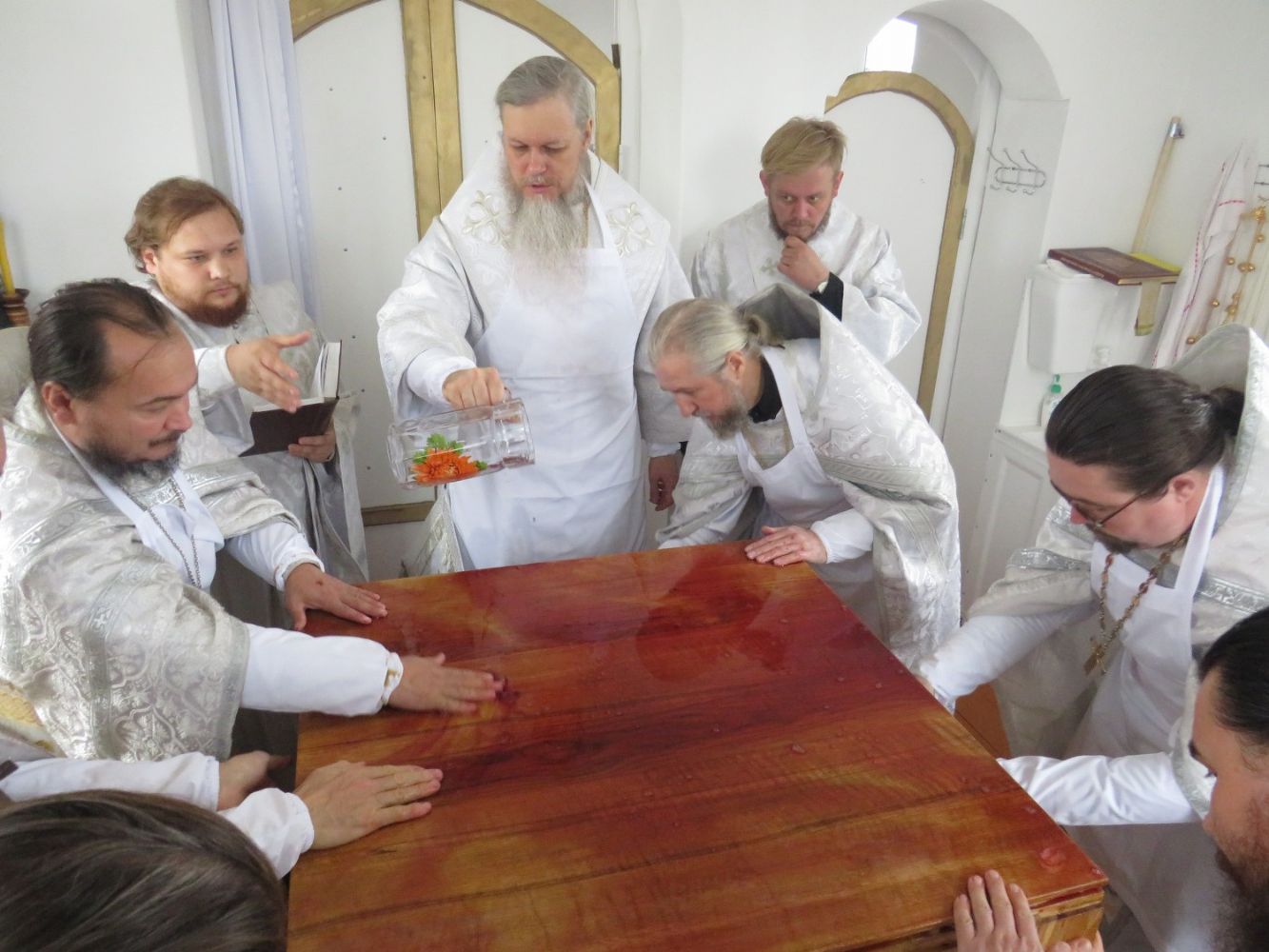 В чине освящения храма и чине Божественной литургии епископу Феофану сослужили: протоиерей Николай Чузаев — настоятель храма Рождества Христова села Арино, протоиерей Леонтий Очетов — настоятель храма Богоявления Господня поселка Морки, иерей Матфей — клирик храма Иоанна Кронштадтского города Волжска, иерей Сергий Петров — настоятель храма Святой Троицы села Помары, иерей Игорь Сапаев — настоятель храма Святой Троицы села Сотнур, иерей Евгений Шамаев — настоятель храма иконы Божией Матери "Казанская" села Шиньша и диакон Иоанн — клирик Никольского кафедрального собора города Волжска.