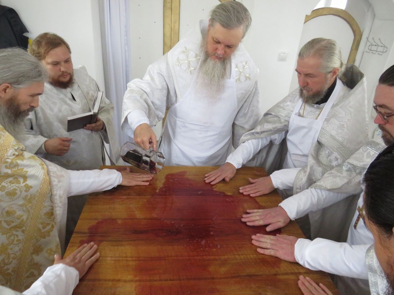 В день освящения храма священнослужители облачаются во все священные одежды, а сверху них надевают белые защитные запоны (передники). Чин освящения храма заключает в себе: устройство престола, омовение и помазание его, облачение престола и жертвенника, освящение стен храма. Архиерей, благословив своих сослужителей, окропляет святой водою столпы престола и углы его поливает крестообразно кипящим воскомастихом, а священники дуновением уст охлаждают его. Воскомастих — состав из воска, мастики, толченого мрамора, росного ладана и других благовонных веществ, служа вместе с гвоздями средством для прикрепления доски престола, в то же время знаменует те ароматы, которыми помазано было тело Спасителя, снятое со Креста.
