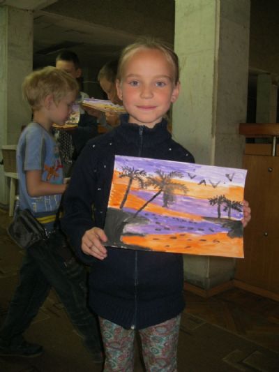 Вторую часть - мастер-класс "Летний пейзаж" для ребят провела сотрудник выставочного центра "Радуга", художница Каукина Татьяна Дмитриевна. И дети, и родители смогли нарисовать экзотичный пейзаж с пальмами.