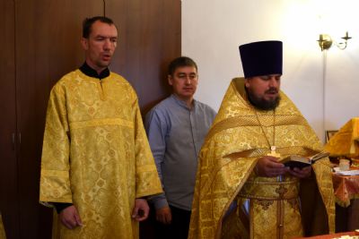 Владыке сослужили настоятель храма протоиерей Николай Ярошевич, настоятель храма Покрова Пресвятой Богородицы с. Чкарино протоиерей Валентин Пылаев и клирик храма Рождества Пресвятой Богородицы с. Семеновка протодиакон Михаил Козловский. Песнопения исполняли два хора: хор храма Всех святых, в земле Русской просиявших, и хор Троицкого храма г. Йошкар-Ола.