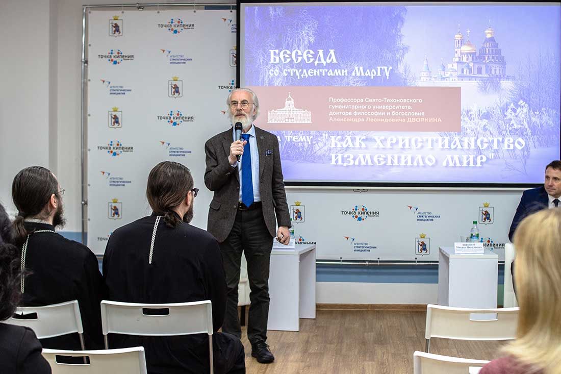 10 февраля в пространстве коллективной работы «Точка кипения – Йошкар-Ола» состоялась встреча студентов Марийского государственного университета с известным историком, религиоведом, сектоведом и общественным деятелем Александром Дворкиным.