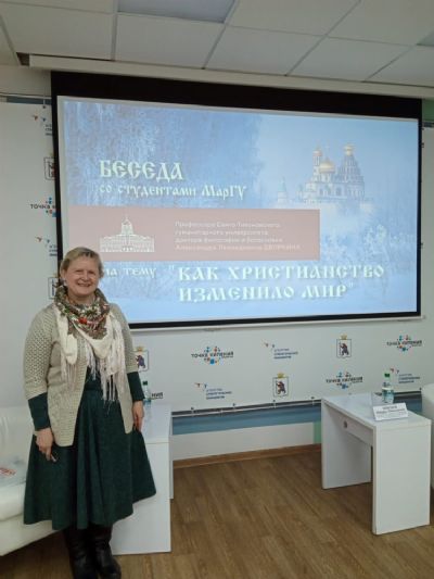 Приятным завершением мероприятия стало вручение лектору открытки ручной работы от участников Клуба православной молодежи МарГУ «Пока горит свеча».