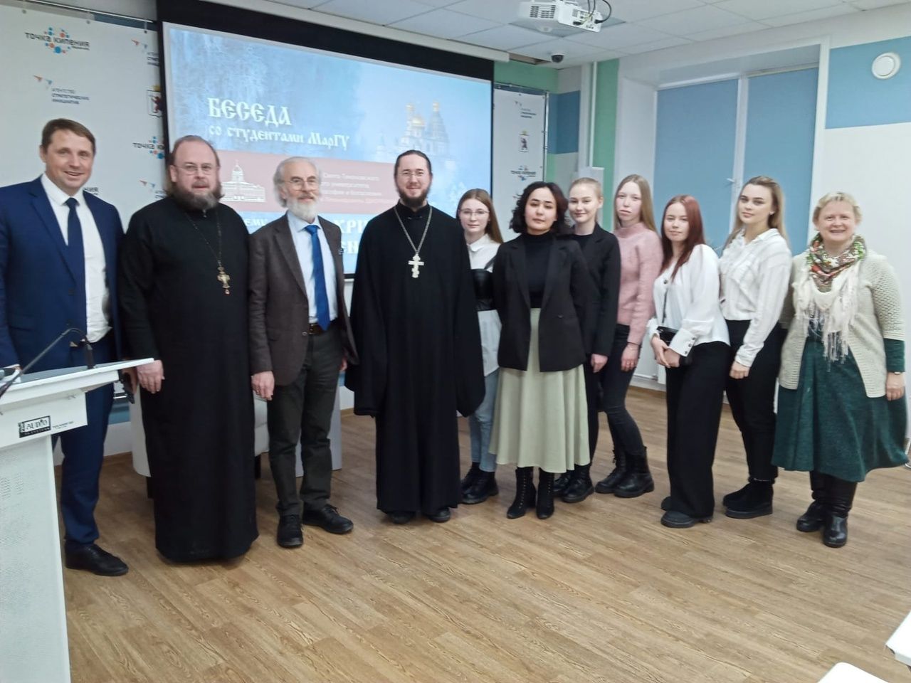 Во встрече приняли участие члены студенческого Клуба православной молодежи «Пока горит свеча», студенты Института национальных культур и межкультурной коммуникации, Психолого-педагогического факультета, Историко-филологического факультета, преподаватели МарГУ.