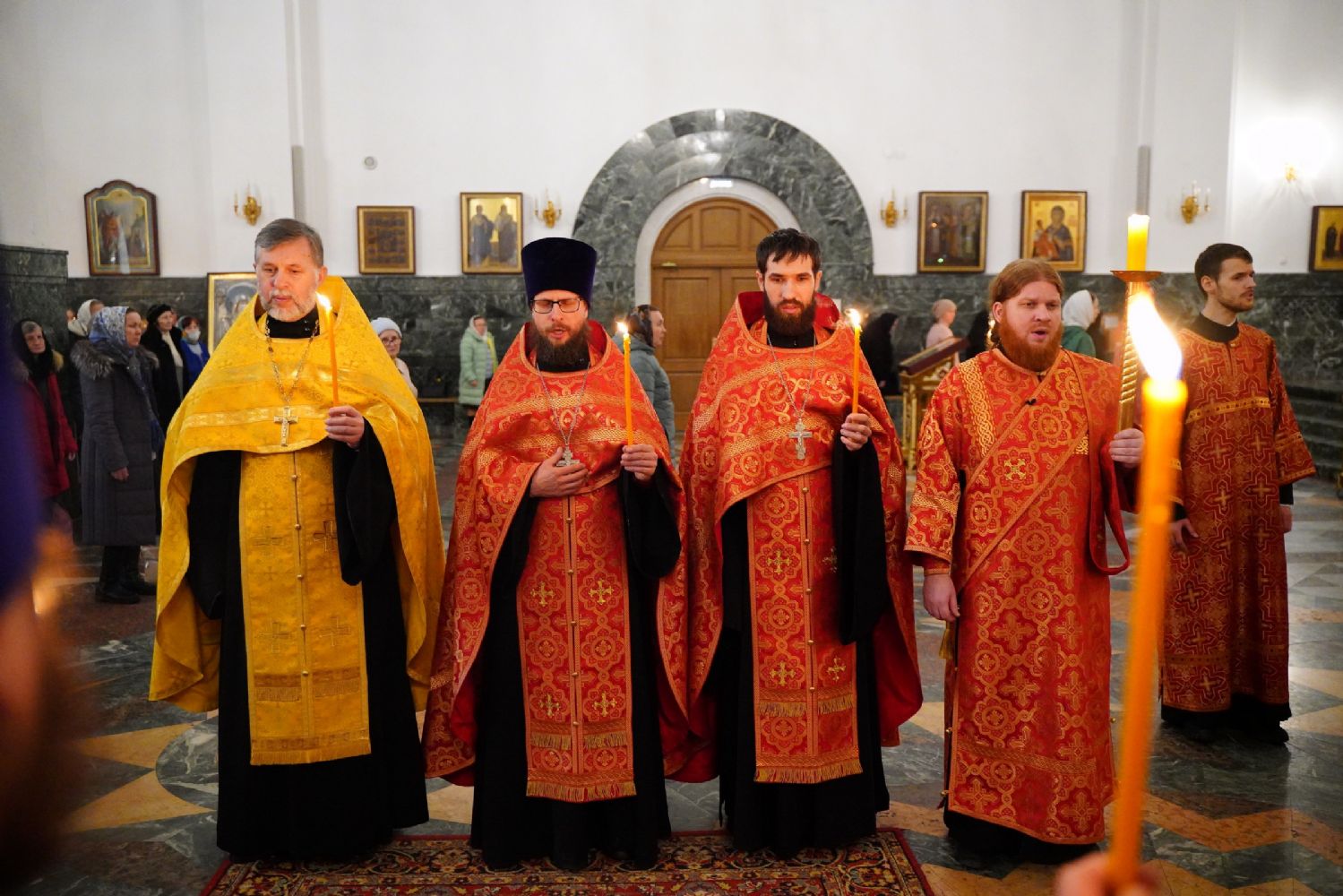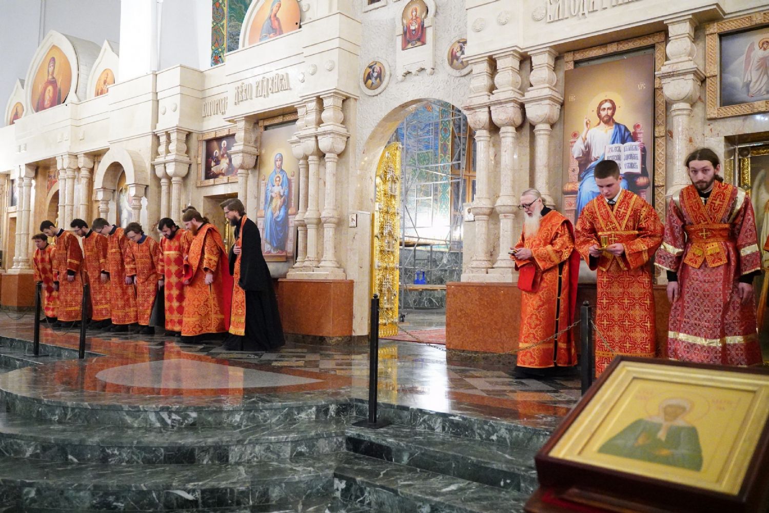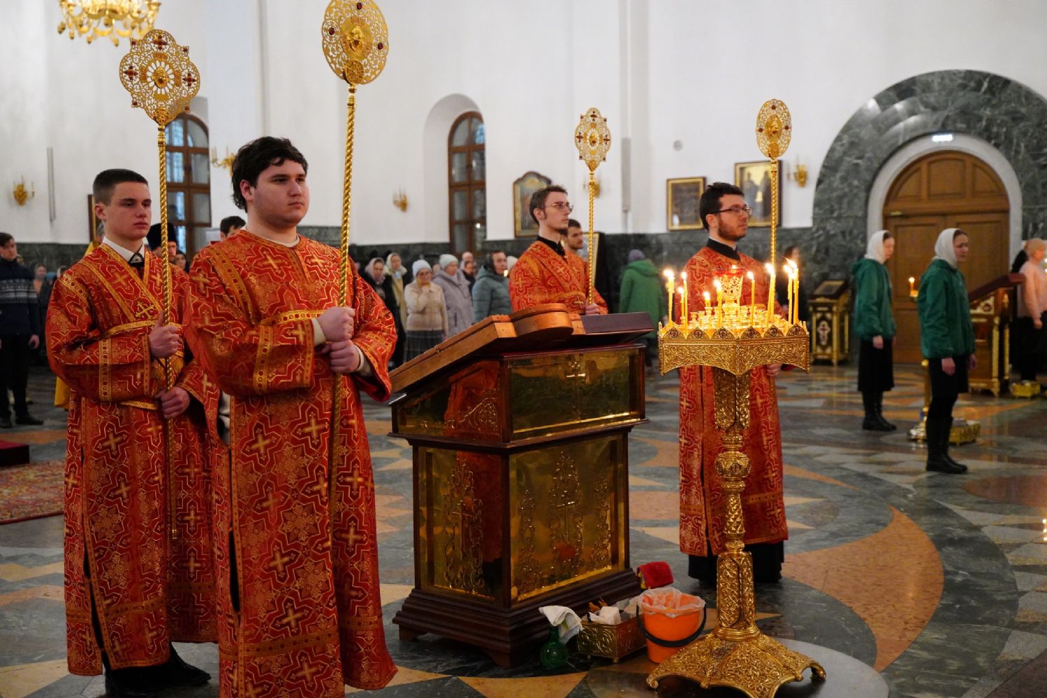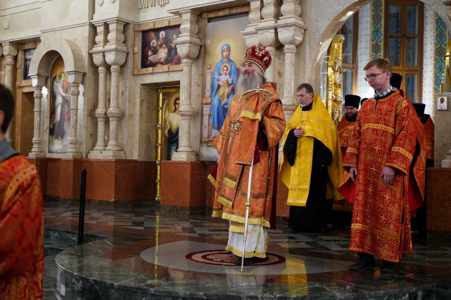 Владыке сослужили ключарь собора протоиерей Сергий Поглазов, полковой священник иерей Георгий Колотов, клирики кафедрального собора иереи Никифор Захаров, Евгений Самойлов, Александр Староверов и Иоанн Милютин, диакон Андрей Дружинин, а также протодиакон Михаил Козловский.