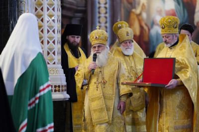 По окончании Литургии митрополит Ташкентский и Узбекистанский Викентий огласил поздравительный адрес от имени членов Священного Синода Русской Православной Церкви и преподнес Его Святейшеству памятный крест.