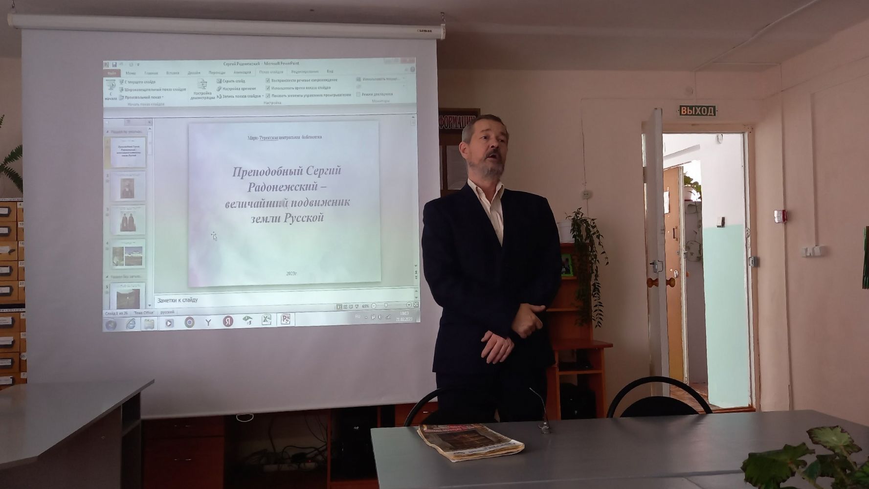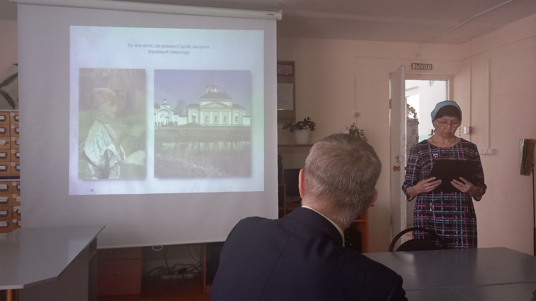 Библиотекарь О.М. Ишмуратова подготовила интересный доклад о жизни преподобного Сергия Радонежского. «Святой Сергий – как раз пример, любимейший самим народом, – ясности, света прозрачного и ровного. Он, разумеется, заступник наш. Через пятьсот лет, всматриваясь в его образ, чувствуешь: да, велика Россия. Да, святая сила ей дана. Да, рядом с силой, истиной мы можем жить. В тяжёлые времена крови, насилия, свирепости, предательств, подлости неземной облик Сергия утоляет и поддерживает».