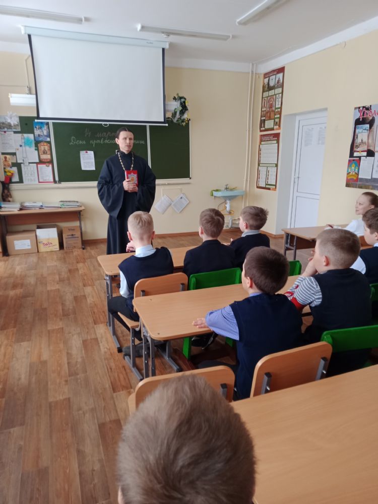 Ученики 4 и 5 классов собрались в школьном кабинете духовно-нравственного воспитания «Содружество». Получив благословение батюшки, все внимательно слушали его наставления. Тема беседы была посвящена Дню православной книги. Самая главная книга православных христиан – это Библия. На простых примерах отец Василий объяснил значение православной книги в жизни каждого человека. Книги учат нас доброте, честности, любви к ближним. Батюшка подробно ответил на многие вопросы ребят.