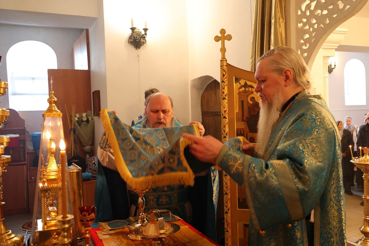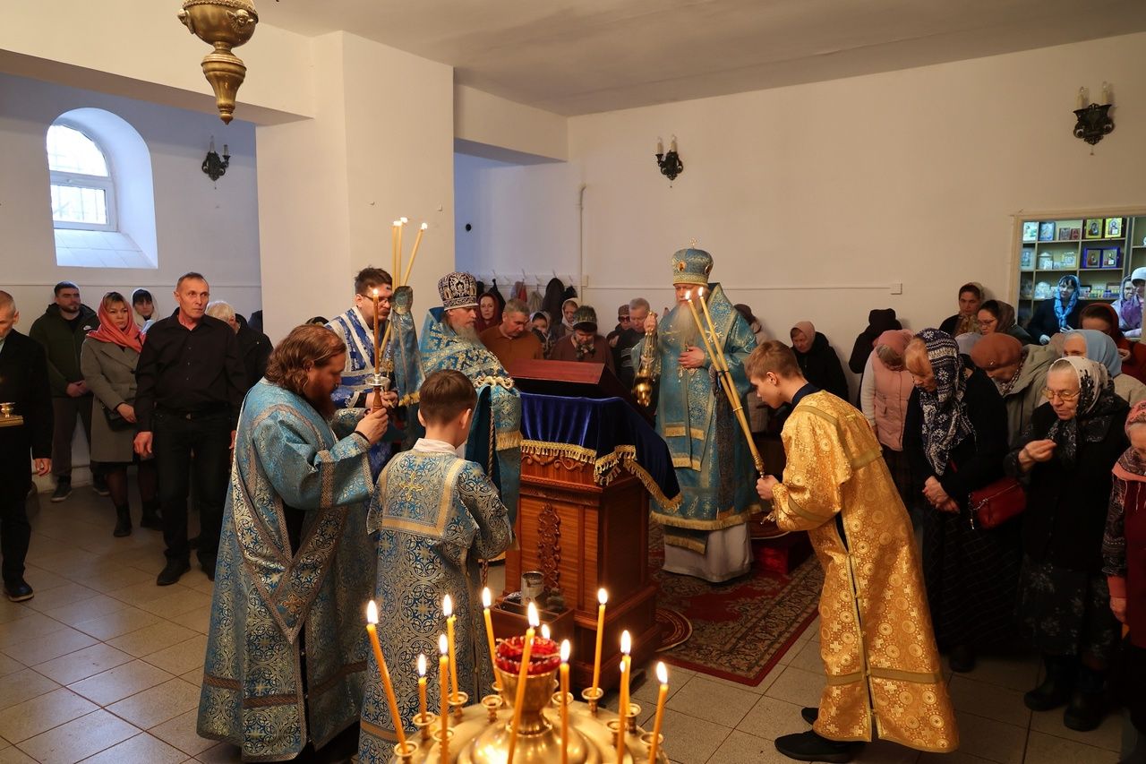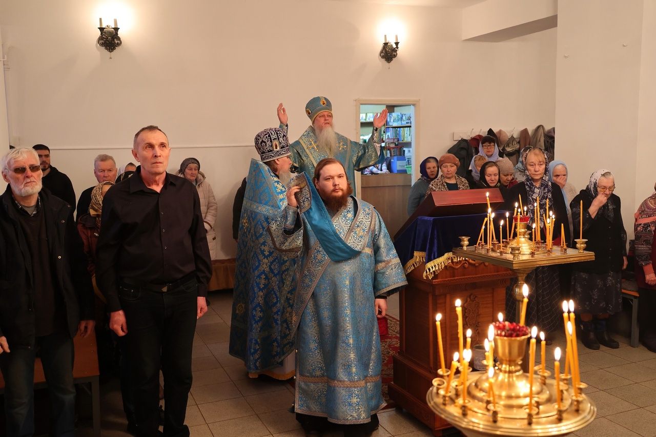 Его Преосвященству сослужили настоятель храма иконы Божией Матери «Всех скорбящих Радость» протоиерей Александр Михайлов и клирик Никольского кафедрального собора диакон Иоанн Захаров. Песнопения исполнял хор храма под управлением Ирины Канашиной.